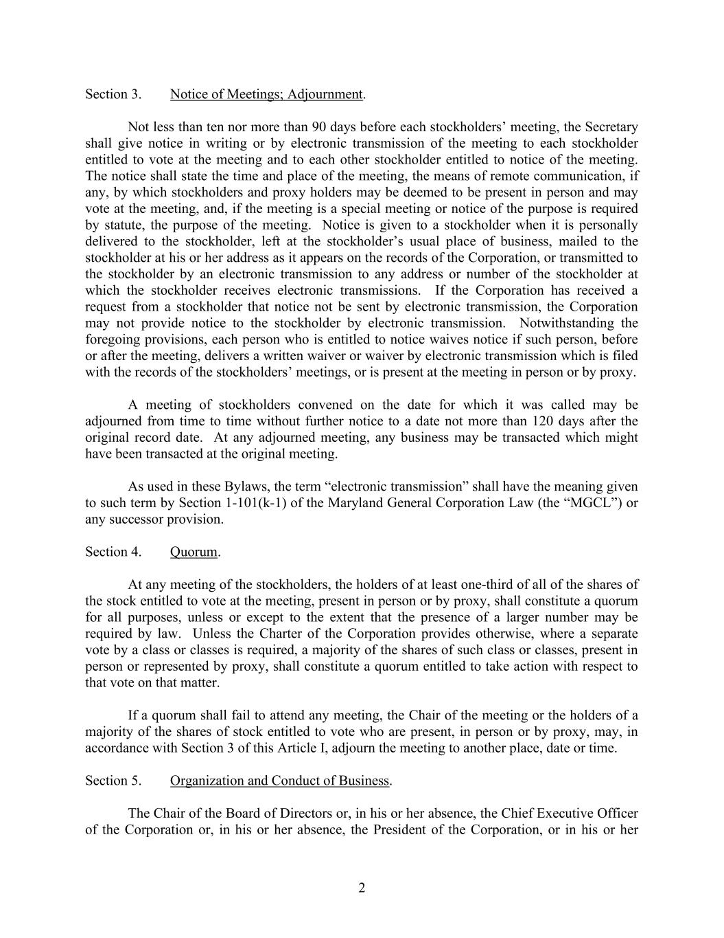 2 Section 3. Notice of Meetings; Adjournment. Not less than ten nor more than 90 days before each stockholders’ meeting, the Secretary shall give notice in writing or by electronic transmission of the meeting to each stockholder entitled to vote at the meeting and to each other stockholder entitled to notice of the meeting. The notice shall state the time and place of the meeting, the means of remote communication, if any, by which stockholders and proxy holders may be deemed to be present in person and may vote at the meeting, and, if the meeting is a special meeting or notice of the purpose is required by statute, the purpose of the meeting. Notice is given to a stockholder when it is personally delivered to the stockholder, left at the stockholder’s usual place of business, mailed to the stockholder at his or her address as it appears on the records of the Corporation, or transmitted to the stockholder by an electronic transmission to any address or number of the stockholder at which the stockholder receives electronic transmissions. If the Corporation has received a request from a stockholder that notice not be sent by electronic transmission, the Corporation may not provide notice to the stockholder by electronic transmission. Notwithstanding the foregoing provisions, each person who is entitled to notice waives notice if such person, before or after the meeting, delivers a written waiver or waiver by electronic transmission which is filed with the records of the stockholders’ meetings, or is present at the meeting in person or by proxy. A meeting of stockholders convened on the date for which it was called may be adjourned from time to time without further notice to a date not more than 120 days after the original record date. At any adjourned meeting, any business may be transacted which might have been transacted at the original meeting. As used in these Bylaws, the term “electronic transmission” shall have the meaning given to such term by Section 1-101(k-1) of the Maryland General Corporation Law (the “MGCL”) or any successor provision. Section 4. Quorum. At any meeting of the stockholders, the holders of at least one-third of all of the shares of the stock entitled to vote at the meeting, present in person or by proxy, shall constitute a quorum for all purposes, unless or except to the extent that the presence of a larger number may be required by law. Unless the Charter of the Corporation provides otherwise, where a separate vote by a class or classes is required, a majority of the shares of such class or classes, present in person or represented by proxy, shall constitute a quorum entitled to take action with respect to that vote on that matter. If a quorum shall fail to attend any meeting, the Chair of the meeting or the holders of a majority of the shares of stock entitled to vote who are present, in person or by proxy, may, in accordance with Section 3 of this Article I, adjourn the meeting to another place, date or time. Section 5. Organization and Conduct of Business. The Chair of the Board of Directors or, in his or her absence, the Chief Executive Officer of the Corporation or, in his or her absence, the President of the Corporation, or in his or her