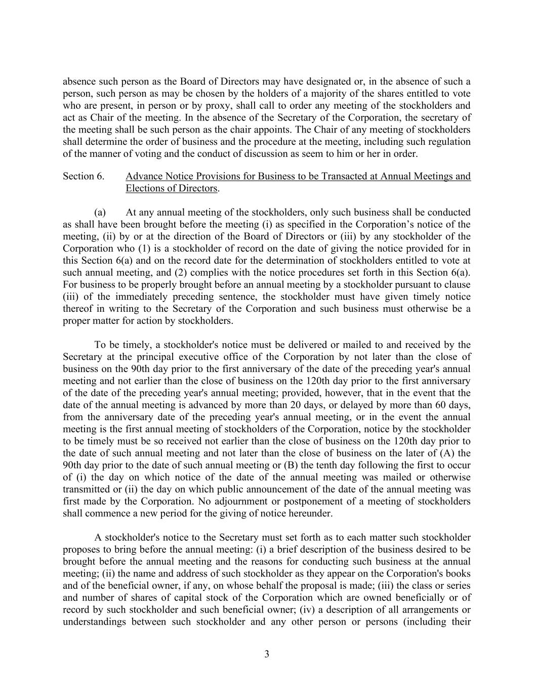 3 absence such person as the Board of Directors may have designated or, in the absence of such a person, such person as may be chosen by the holders of a majority of the shares entitled to vote who are present, in person or by proxy, shall call to order any meeting of the stockholders and act as Chair of the meeting. In the absence of the Secretary of the Corporation, the secretary of the meeting shall be such person as the chair appoints. The Chair of any meeting of stockholders shall determine the order of business and the procedure at the meeting, including such regulation of the manner of voting and the conduct of discussion as seem to him or her in order. Section 6. Advance Notice Provisions for Business to be Transacted at Annual Meetings and Elections of Directors. (a) At any annual meeting of the stockholders, only such business shall be conducted as shall have been brought before the meeting (i) as specified in the Corporation’s notice of the meeting, (ii) by or at the direction of the Board of Directors or (iii) by any stockholder of the Corporation who (1) is a stockholder of record on the date of giving the notice provided for in this Section 6(a) and on the record date for the determination of stockholders entitled to vote at such annual meeting, and (2) complies with the notice procedures set forth in this Section 6(a). For business to be properly brought before an annual meeting by a stockholder pursuant to clause (iii) of the immediately preceding sentence, the stockholder must have given timely notice thereof in writing to the Secretary of the Corporation and such business must otherwise be a proper matter for action by stockholders. To be timely, a stockholder's notice must be delivered or mailed to and received by the Secretary at the principal executive office of the Corporation by not later than the close of business on the 90th day prior to the first anniversary of the date of the preceding year's annual meeting and not earlier than the close of business on the 120th day prior to the first anniversary of the date of the preceding year's annual meeting; provided, however, that in the event that the date of the annual meeting is advanced by more than 20 days, or delayed by more than 60 days, from the anniversary date of the preceding year's annual meeting, or in the event the annual meeting is the first annual meeting of stockholders of the Corporation, notice by the stockholder to be timely must be so received not earlier than the close of business on the 120th day prior to the date of such annual meeting and not later than the close of business on the later of (A) the 90th day prior to the date of such annual meeting or (B) the tenth day following the first to occur of (i) the day on which notice of the date of the annual meeting was mailed or otherwise transmitted or (ii) the day on which public announcement of the date of the annual meeting was first made by the Corporation. No adjournment or postponement of a meeting of stockholders shall commence a new period for the giving of notice hereunder. A stockholder's notice to the Secretary must set forth as to each matter such stockholder proposes to bring before the annual meeting: (i) a brief description of the business desired to be brought before the annual meeting and the reasons for conducting such business at the annual meeting; (ii) the name and address of such stockholder as they appear on the Corporation's books and of the beneficial owner, if any, on whose behalf the proposal is made; (iii) the class or series and number of shares of capital stock of the Corporation which are owned beneficially or of record by such stockholder and such beneficial owner; (iv) a description of all arrangements or understandings between such stockholder and any other person or persons (including their