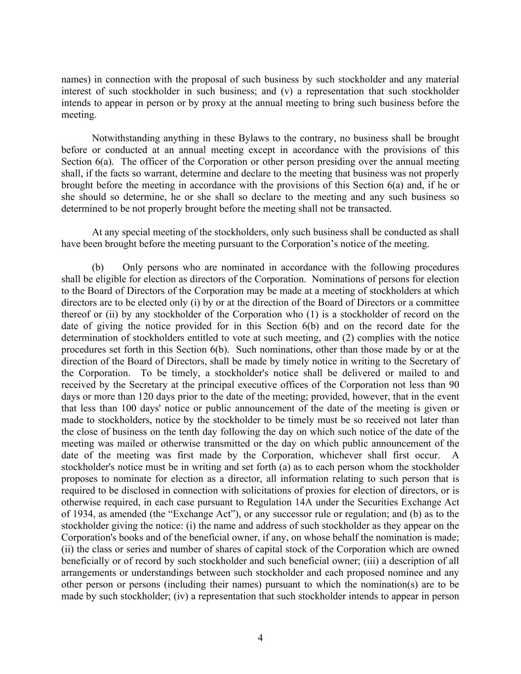 4 names) in connection with the proposal of such business by such stockholder and any material interest of such stockholder in such business; and (v) a representation that such stockholder intends to appear in person or by proxy at the annual meeting to bring such business before the meeting. Notwithstanding anything in these Bylaws to the contrary, no business shall be brought before or conducted at an annual meeting except in accordance with the provisions of this Section 6(a). The officer of the Corporation or other person presiding over the annual meeting shall, if the facts so warrant, determine and declare to the meeting that business was not properly brought before the meeting in accordance with the provisions of this Section 6(a) and, if he or she should so determine, he or she shall so declare to the meeting and any such business so determined to be not properly brought before the meeting shall not be transacted. At any special meeting of the stockholders, only such business shall be conducted as shall have been brought before the meeting pursuant to the Corporation’s notice of the meeting. (b) Only persons who are nominated in accordance with the following procedures shall be eligible for election as directors of the Corporation. Nominations of persons for election to the Board of Directors of the Corporation may be made at a meeting of stockholders at which directors are to be elected only (i) by or at the direction of the Board of Directors or a committee thereof or (ii) by any stockholder of the Corporation who (1) is a stockholder of record on the date of giving the notice provided for in this Section 6(b) and on the record date for the determination of stockholders entitled to vote at such meeting, and (2) complies with the notice procedures set forth in this Section 6(b). Such nominations, other than those made by or at the direction of the Board of Directors, shall be made by timely notice in writing to the Secretary of the Corporation. To be timely, a stockholder's notice shall be delivered or mailed to and received by the Secretary at the principal executive offices of the Corporation not less than 90 days or more than 120 days prior to the date of the meeting; provided, however, that in the event that less than 100 days' notice or public announcement of the date of the meeting is given or made to stockholders, notice by the stockholder to be timely must be so received not later than the close of business on the tenth day following the day on which such notice of the date of the meeting was mailed or otherwise transmitted or the day on which public announcement of the date of the meeting was first made by the Corporation, whichever shall first occur. A stockholder's notice must be in writing and set forth (a) as to each person whom the stockholder proposes to nominate for election as a director, all information relating to such person that is required to be disclosed in connection with solicitations of proxies for election of directors, or is otherwise required, in each case pursuant to Regulation 14A under the Securities Exchange Act of 1934, as amended (the “Exchange Act”), or any successor rule or regulation; and (b) as to the stockholder giving the notice: (i) the name and address of such stockholder as they appear on the Corporation's books and of the beneficial owner, if any, on whose behalf the nomination is made; (ii) the class or series and number of shares of capital stock of the Corporation which are owned beneficially or of record by such stockholder and such beneficial owner; (iii) a description of all arrangements or understandings between such stockholder and each proposed nominee and any other person or persons (including their names) pursuant to which the nomination(s) are to be made by such stockholder; (iv) a representation that such stockholder intends to appear in person