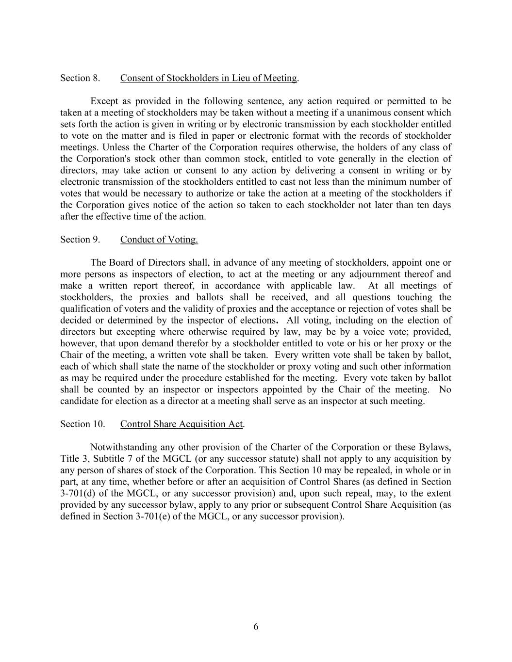 6 Section 8. Consent of Stockholders in Lieu of Meeting. Except as provided in the following sentence, any action required or permitted to be taken at a meeting of stockholders may be taken without a meeting if a unanimous consent which sets forth the action is given in writing or by electronic transmission by each stockholder entitled to vote on the matter and is filed in paper or electronic format with the records of stockholder meetings. Unless the Charter of the Corporation requires otherwise, the holders of any class of the Corporation's stock other than common stock, entitled to vote generally in the election of directors, may take action or consent to any action by delivering a consent in writing or by electronic transmission of the stockholders entitled to cast not less than the minimum number of votes that would be necessary to authorize or take the action at a meeting of the stockholders if the Corporation gives notice of the action so taken to each stockholder not later than ten days after the effective time of the action. Section 9. Conduct of Voting. The Board of Directors shall, in advance of any meeting of stockholders, appoint one or more persons as inspectors of election, to act at the meeting or any adjournment thereof and make a written report thereof, in accordance with applicable law. At all meetings of stockholders, the proxies and ballots shall be received, and all questions touching the qualification of voters and the validity of proxies and the acceptance or rejection of votes shall be decided or determined by the inspector of elections. All voting, including on the election of directors but excepting where otherwise required by law, may be by a voice vote; provided, however, that upon demand therefor by a stockholder entitled to vote or his or her proxy or the Chair of the meeting, a written vote shall be taken. Every written vote shall be taken by ballot, each of which shall state the name of the stockholder or proxy voting and such other information as may be required under the procedure established for the meeting. Every vote taken by ballot shall be counted by an inspector or inspectors appointed by the Chair of the meeting. No candidate for election as a director at a meeting shall serve as an inspector at such meeting. Section 10. Control Share Acquisition Act. Notwithstanding any other provision of the Charter of the Corporation or these Bylaws, Title 3, Subtitle 7 of the MGCL (or any successor statute) shall not apply to any acquisition by any person of shares of stock of the Corporation. This Section 10 may be repealed, in whole or in part, at any time, whether before or after an acquisition of Control Shares (as defined in Section 3-701(d) of the MGCL, or any successor provision) and, upon such repeal, may, to the extent provided by any successor bylaw, apply to any prior or subsequent Control Share Acquisition (as defined in Section 3-701(e) of the MGCL, or any successor provision).