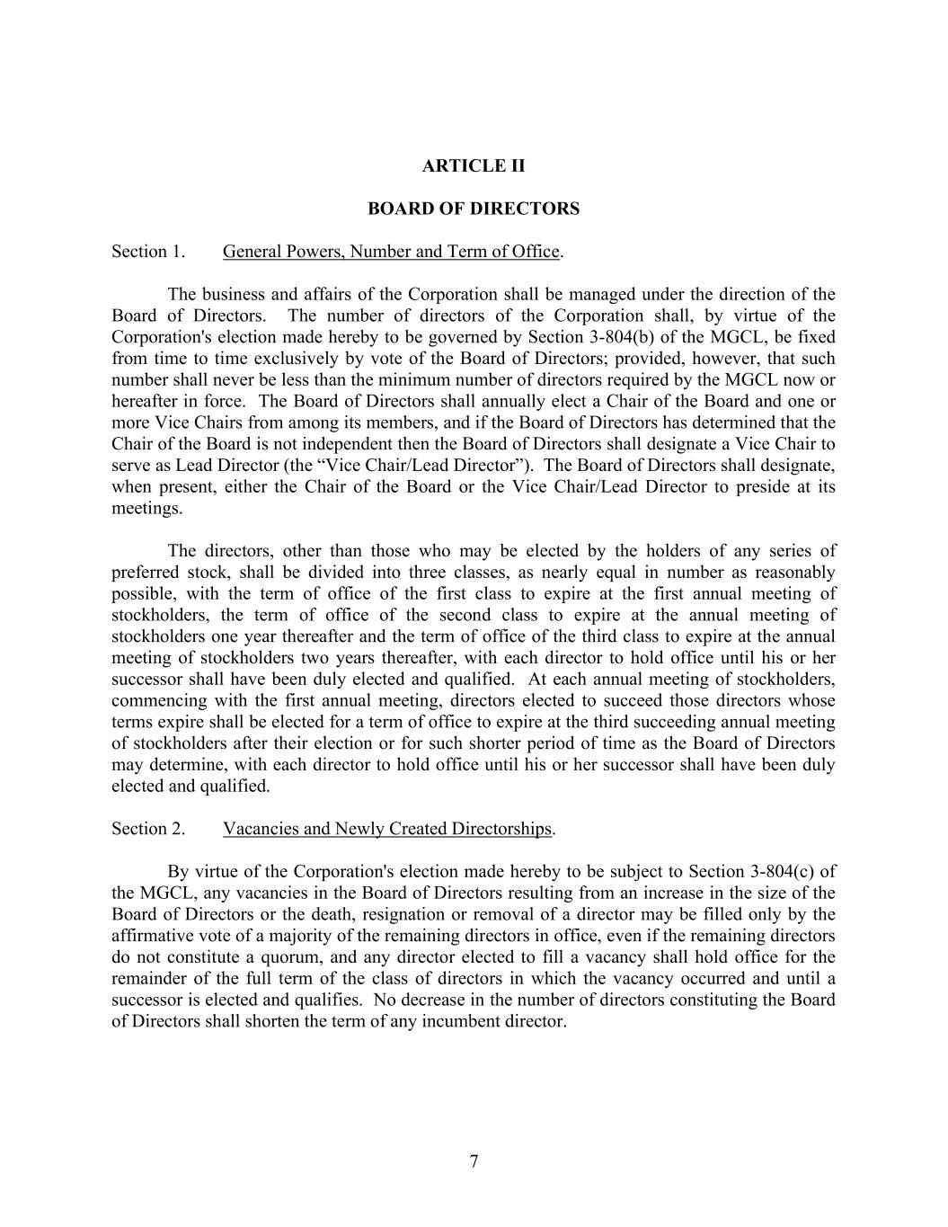 7 ARTICLE II BOARD OF DIRECTORS Section 1. General Powers, Number and Term of Office. The business and affairs of the Corporation shall be managed under the direction of the Board of Directors. The number of directors of the Corporation shall, by virtue of the Corporation's election made hereby to be governed by Section 3-804(b) of the MGCL, be fixed from time to time exclusively by vote of the Board of Directors; provided, however, that such number shall never be less than the minimum number of directors required by the MGCL now or hereafter in force. The Board of Directors shall annually elect a Chair of the Board and one or more Vice Chairs from among its members, and if the Board of Directors has determined that the Chair of the Board is not independent then the Board of Directors shall designate a Vice Chair to serve as Lead Director (the “Vice Chair/Lead Director”). The Board of Directors shall designate, when present, either the Chair of the Board or the Vice Chair/Lead Director to preside at its meetings. The directors, other than those who may be elected by the holders of any series of preferred stock, shall be divided into three classes, as nearly equal in number as reasonably possible, with the term of office of the first class to expire at the first annual meeting of stockholders, the term of office of the second class to expire at the annual meeting of stockholders one year thereafter and the term of office of the third class to expire at the annual meeting of stockholders two years thereafter, with each director to hold office until his or her successor shall have been duly elected and qualified. At each annual meeting of stockholders, commencing with the first annual meeting, directors elected to succeed those directors whose terms expire shall be elected for a term of office to expire at the third succeeding annual meeting of stockholders after their election or for such shorter period of time as the Board of Directors may determine, with each director to hold office until his or her successor shall have been duly elected and qualified. Section 2. Vacancies and Newly Created Directorships. By virtue of the Corporation's election made hereby to be subject to Section 3-804(c) of the MGCL, any vacancies in the Board of Directors resulting from an increase in the size of the Board of Directors or the death, resignation or removal of a director may be filled only by the affirmative vote of a majority of the remaining directors in office, even if the remaining directors do not constitute a quorum, and any director elected to fill a vacancy shall hold office for the remainder of the full term of the class of directors in which the vacancy occurred and until a successor is elected and qualifies. No decrease in the number of directors constituting the Board of Directors shall shorten the term of any incumbent director.