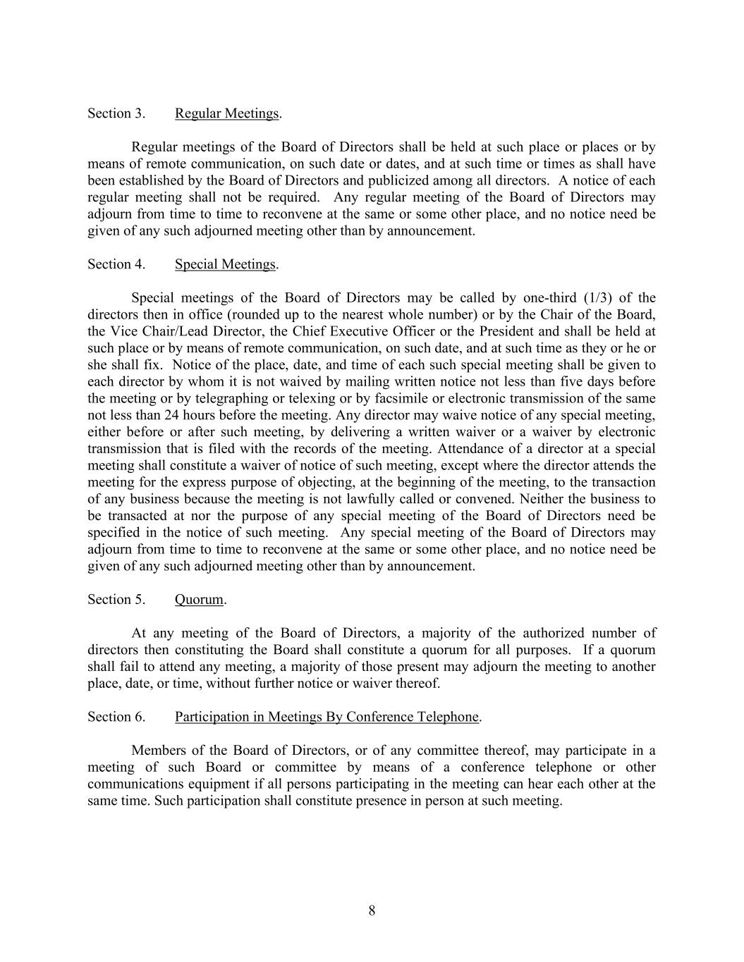 8 Section 3. Regular Meetings. Regular meetings of the Board of Directors shall be held at such place or places or by means of remote communication, on such date or dates, and at such time or times as shall have been established by the Board of Directors and publicized among all directors. A notice of each regular meeting shall not be required. Any regular meeting of the Board of Directors may adjourn from time to time to reconvene at the same or some other place, and no notice need be given of any such adjourned meeting other than by announcement. Section 4. Special Meetings. Special meetings of the Board of Directors may be called by one-third (1/3) of the directors then in office (rounded up to the nearest whole number) or by the Chair of the Board, the Vice Chair/Lead Director, the Chief Executive Officer or the President and shall be held at such place or by means of remote communication, on such date, and at such time as they or he or she shall fix. Notice of the place, date, and time of each such special meeting shall be given to each director by whom it is not waived by mailing written notice not less than five days before the meeting or by telegraphing or telexing or by facsimile or electronic transmission of the same not less than 24 hours before the meeting. Any director may waive notice of any special meeting, either before or after such meeting, by delivering a written waiver or a waiver by electronic transmission that is filed with the records of the meeting. Attendance of a director at a special meeting shall constitute a waiver of notice of such meeting, except where the director attends the meeting for the express purpose of objecting, at the beginning of the meeting, to the transaction of any business because the meeting is not lawfully called or convened. Neither the business to be transacted at nor the purpose of any special meeting of the Board of Directors need be specified in the notice of such meeting. Any special meeting of the Board of Directors may adjourn from time to time to reconvene at the same or some other place, and no notice need be given of any such adjourned meeting other than by announcement. Section 5. Quorum. At any meeting of the Board of Directors, a majority of the authorized number of directors then constituting the Board shall constitute a quorum for all purposes. If a quorum shall fail to attend any meeting, a majority of those present may adjourn the meeting to another place, date, or time, without further notice or waiver thereof. Section 6. Participation in Meetings By Conference Telephone. Members of the Board of Directors, or of any committee thereof, may participate in a meeting of such Board or committee by means of a conference telephone or other communications equipment if all persons participating in the meeting can hear each other at the same time. Such participation shall constitute presence in person at such meeting.