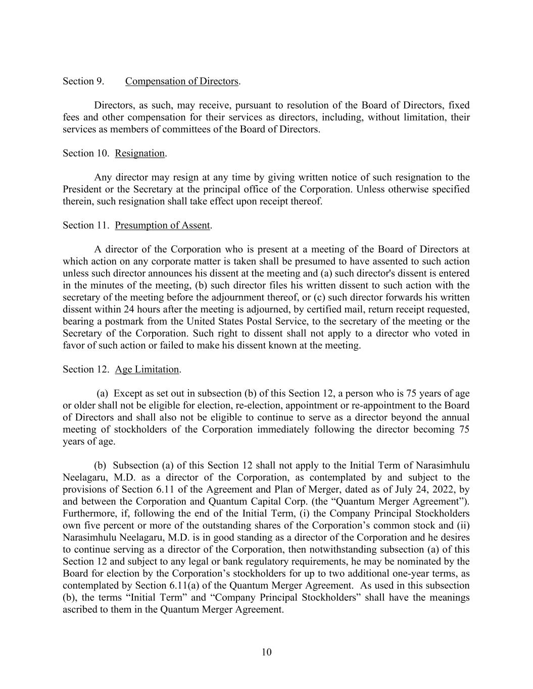 10 Section 9. Compensation of Directors. Directors, as such, may receive, pursuant to resolution of the Board of Directors, fixed fees and other compensation for their services as directors, including, without limitation, their services as members of committees of the Board of Directors. Section 10. Resignation. Any director may resign at any time by giving written notice of such resignation to the President or the Secretary at the principal office of the Corporation. Unless otherwise specified therein, such resignation shall take effect upon receipt thereof. Section 11. Presumption of Assent. A director of the Corporation who is present at a meeting of the Board of Directors at which action on any corporate matter is taken shall be presumed to have assented to such action unless such director announces his dissent at the meeting and (a) such director's dissent is entered in the minutes of the meeting, (b) such director files his written dissent to such action with the secretary of the meeting before the adjournment thereof, or (c) such director forwards his written dissent within 24 hours after the meeting is adjourned, by certified mail, return receipt requested, bearing a postmark from the United States Postal Service, to the secretary of the meeting or the Secretary of the Corporation. Such right to dissent shall not apply to a director who voted in favor of such action or failed to make his dissent known at the meeting. Section 12. Age Limitation. (a) Except as set out in subsection (b) of this Section 12, a person who is 75 years of age or older shall not be eligible for election, re-election, appointment or re-appointment to the Board of Directors and shall also not be eligible to continue to serve as a director beyond the annual meeting of stockholders of the Corporation immediately following the director becoming 75 years of age. (b) Subsection (a) of this Section 12 shall not apply to the Initial Term of Narasimhulu Neelagaru, M.D. as a director of the Corporation, as contemplated by and subject to the provisions of Section 6.11 of the Agreement and Plan of Merger, dated as of July 24, 2022, by and between the Corporation and Quantum Capital Corp. (the “Quantum Merger Agreement”). Furthermore, if, following the end of the Initial Term, (i) the Company Principal Stockholders own five percent or more of the outstanding shares of the Corporation’s common stock and (ii) Narasimhulu Neelagaru, M.D. is in good standing as a director of the Corporation and he desires to continue serving as a director of the Corporation, then notwithstanding subsection (a) of this Section 12 and subject to any legal or bank regulatory requirements, he may be nominated by the Board for election by the Corporation’s stockholders for up to two additional one-year terms, as contemplated by Section 6.11(a) of the Quantum Merger Agreement. As used in this subsection (b), the terms “Initial Term” and “Company Principal Stockholders” shall have the meanings ascribed to them in the Quantum Merger Agreement.