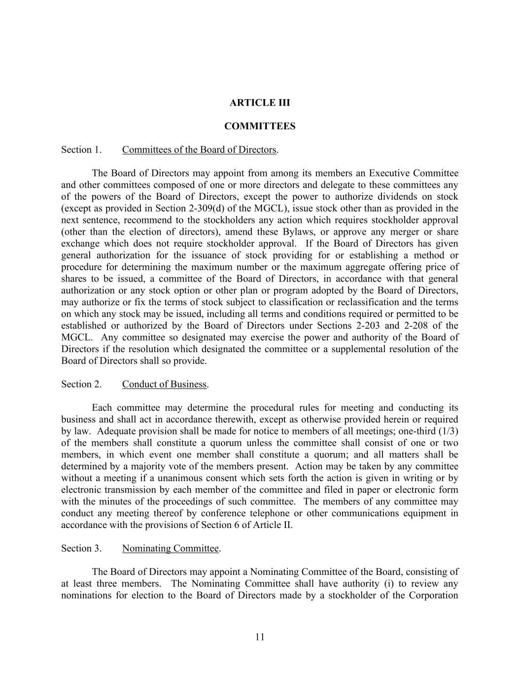 11 ARTICLE III COMMITTEES Section 1. Committees of the Board of Directors. The Board of Directors may appoint from among its members an Executive Committee and other committees composed of one or more directors and delegate to these committees any of the powers of the Board of Directors, except the power to authorize dividends on stock (except as provided in Section 2-309(d) of the MGCL), issue stock other than as provided in the next sentence, recommend to the stockholders any action which requires stockholder approval (other than the election of directors), amend these Bylaws, or approve any merger or share exchange which does not require stockholder approval. If the Board of Directors has given general authorization for the issuance of stock providing for or establishing a method or procedure for determining the maximum number or the maximum aggregate offering price of shares to be issued, a committee of the Board of Directors, in accordance with that general authorization or any stock option or other plan or program adopted by the Board of Directors, may authorize or fix the terms of stock subject to classification or reclassification and the terms on which any stock may be issued, including all terms and conditions required or permitted to be established or authorized by the Board of Directors under Sections 2-203 and 2-208 of the MGCL. Any committee so designated may exercise the power and authority of the Board of Directors if the resolution which designated the committee or a supplemental resolution of the Board of Directors shall so provide. Section 2. Conduct of Business. Each committee may determine the procedural rules for meeting and conducting its business and shall act in accordance therewith, except as otherwise provided herein or required by law. Adequate provision shall be made for notice to members of all meetings; one-third (1/3) of the members shall constitute a quorum unless the committee shall consist of one or two members, in which event one member shall constitute a quorum; and all matters shall be determined by a majority vote of the members present. Action may be taken by any committee without a meeting if a unanimous consent which sets forth the action is given in writing or by electronic transmission by each member of the committee and filed in paper or electronic form with the minutes of the proceedings of such committee. The members of any committee may conduct any meeting thereof by conference telephone or other communications equipment in accordance with the provisions of Section 6 of Article II. Section 3. Nominating Committee. The Board of Directors may appoint a Nominating Committee of the Board, consisting of at least three members. The Nominating Committee shall have authority (i) to review any nominations for election to the Board of Directors made by a stockholder of the Corporation