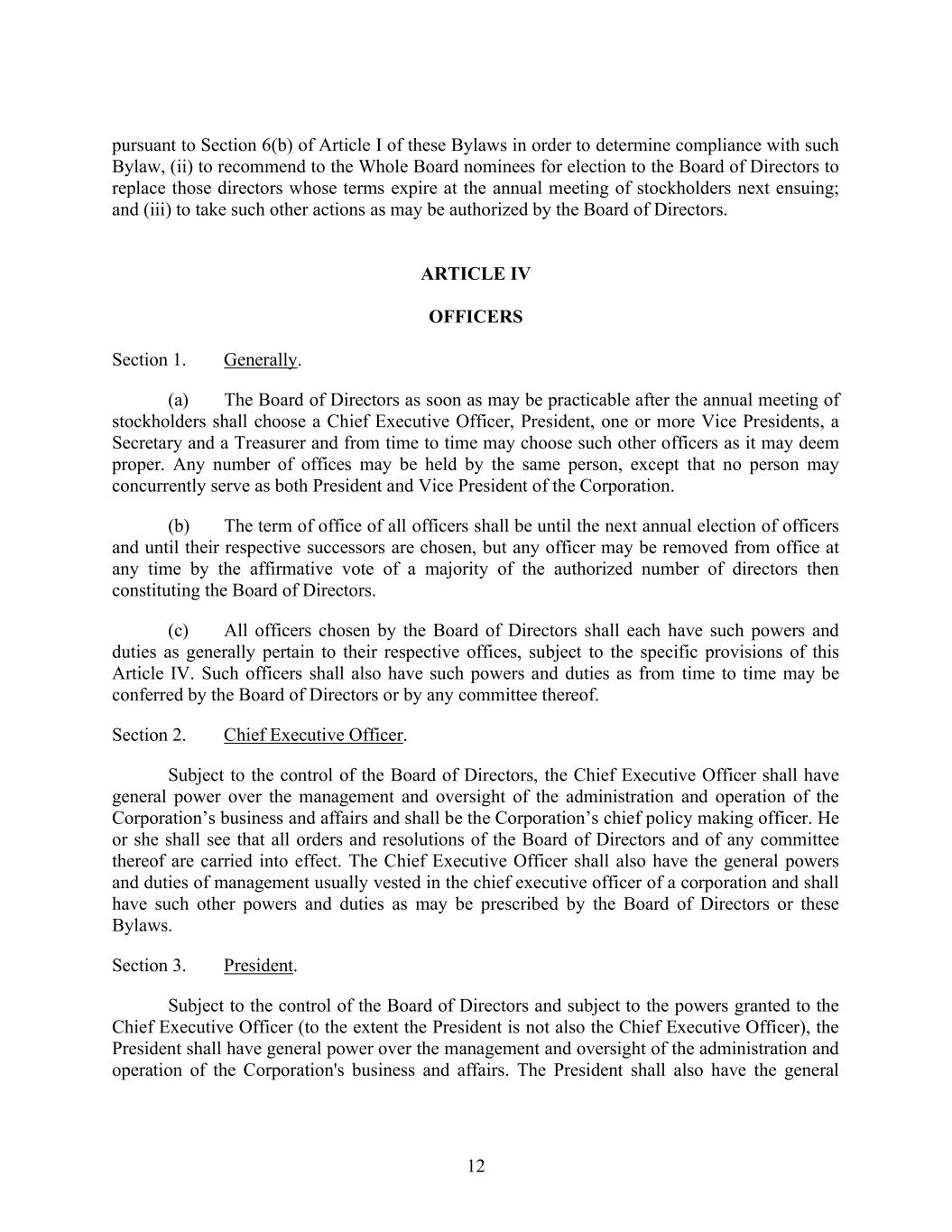 12 pursuant to Section 6(b) of Article I of these Bylaws in order to determine compliance with such Bylaw, (ii) to recommend to the Whole Board nominees for election to the Board of Directors to replace those directors whose terms expire at the annual meeting of stockholders next ensuing; and (iii) to take such other actions as may be authorized by the Board of Directors. ARTICLE IV OFFICERS Section 1. Generally. (a) The Board of Directors as soon as may be practicable after the annual meeting of stockholders shall choose a Chief Executive Officer, President, one or more Vice Presidents, a Secretary and a Treasurer and from time to time may choose such other officers as it may deem proper. Any number of offices may be held by the same person, except that no person may concurrently serve as both President and Vice President of the Corporation. (b) The term of office of all officers shall be until the next annual election of officers and until their respective successors are chosen, but any officer may be removed from office at any time by the affirmative vote of a majority of the authorized number of directors then constituting the Board of Directors. (c) All officers chosen by the Board of Directors shall each have such powers and duties as generally pertain to their respective offices, subject to the specific provisions of this Article IV. Such officers shall also have such powers and duties as from time to time may be conferred by the Board of Directors or by any committee thereof. Section 2. Chief Executive Officer. Subject to the control of the Board of Directors, the Chief Executive Officer shall have general power over the management and oversight of the administration and operation of the Corporation’s business and affairs and shall be the Corporation’s chief policy making officer. He or she shall see that all orders and resolutions of the Board of Directors and of any committee thereof are carried into effect. The Chief Executive Officer shall also have the general powers and duties of management usually vested in the chief executive officer of a corporation and shall have such other powers and duties as may be prescribed by the Board of Directors or these Bylaws. Section 3. President. Subject to the control of the Board of Directors and subject to the powers granted to the Chief Executive Officer (to the extent the President is not also the Chief Executive Officer), the President shall have general power over the management and oversight of the administration and operation of the Corporation's business and affairs. The President shall also have the general