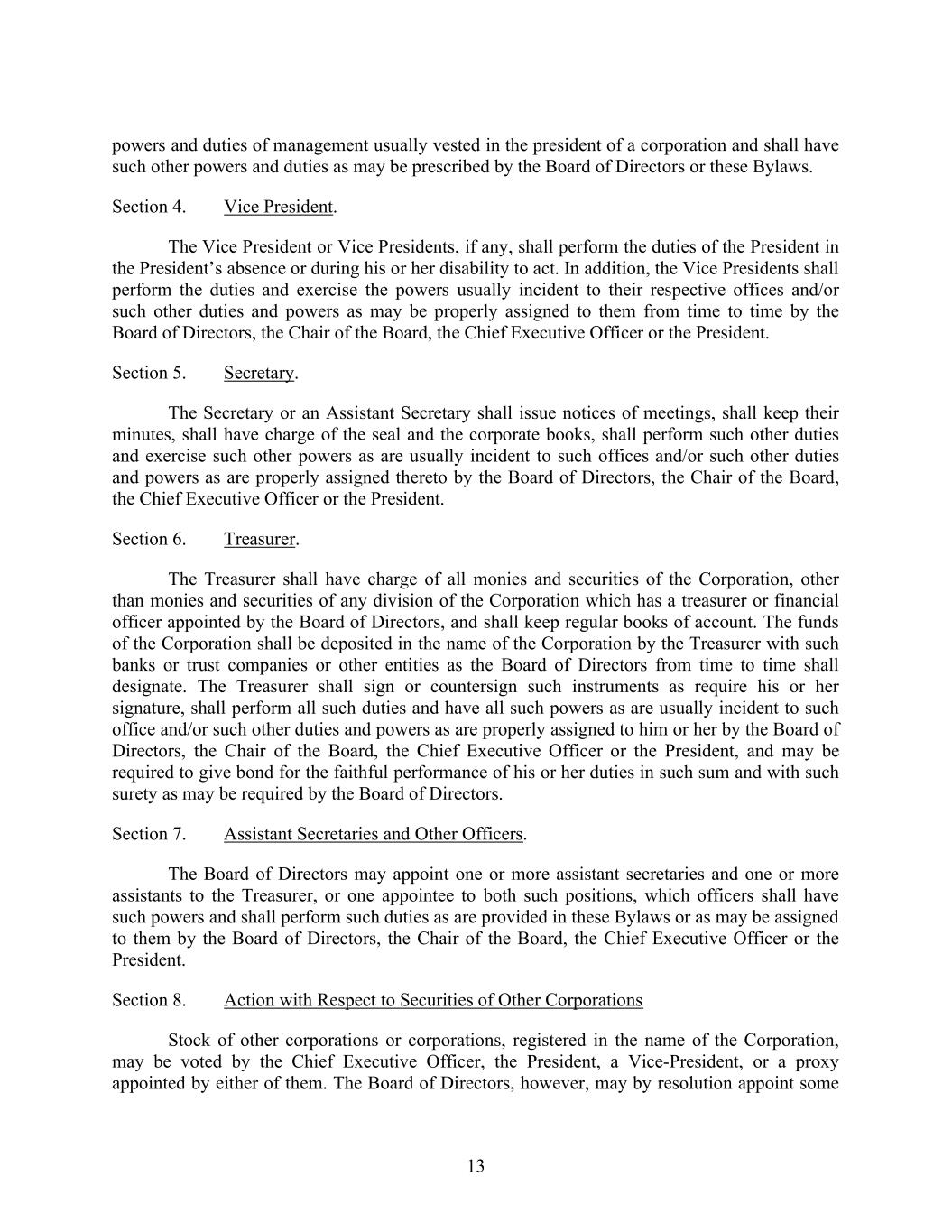 13 powers and duties of management usually vested in the president of a corporation and shall have such other powers and duties as may be prescribed by the Board of Directors or these Bylaws. Section 4. Vice President. The Vice President or Vice Presidents, if any, shall perform the duties of the President in the President’s absence or during his or her disability to act. In addition, the Vice Presidents shall perform the duties and exercise the powers usually incident to their respective offices and/or such other duties and powers as may be properly assigned to them from time to time by the Board of Directors, the Chair of the Board, the Chief Executive Officer or the President. Section 5. Secretary. The Secretary or an Assistant Secretary shall issue notices of meetings, shall keep their minutes, shall have charge of the seal and the corporate books, shall perform such other duties and exercise such other powers as are usually incident to such offices and/or such other duties and powers as are properly assigned thereto by the Board of Directors, the Chair of the Board, the Chief Executive Officer or the President. Section 6. Treasurer. The Treasurer shall have charge of all monies and securities of the Corporation, other than monies and securities of any division of the Corporation which has a treasurer or financial officer appointed by the Board of Directors, and shall keep regular books of account. The funds of the Corporation shall be deposited in the name of the Corporation by the Treasurer with such banks or trust companies or other entities as the Board of Directors from time to time shall designate. The Treasurer shall sign or countersign such instruments as require his or her signature, shall perform all such duties and have all such powers as are usually incident to such office and/or such other duties and powers as are properly assigned to him or her by the Board of Directors, the Chair of the Board, the Chief Executive Officer or the President, and may be required to give bond for the faithful performance of his or her duties in such sum and with such surety as may be required by the Board of Directors. Section 7. Assistant Secretaries and Other Officers. The Board of Directors may appoint one or more assistant secretaries and one or more assistants to the Treasurer, or one appointee to both such positions, which officers shall have such powers and shall perform such duties as are provided in these Bylaws or as may be assigned to them by the Board of Directors, the Chair of the Board, the Chief Executive Officer or the President. Section 8. Action with Respect to Securities of Other Corporations Stock of other corporations or corporations, registered in the name of the Corporation, may be voted by the Chief Executive Officer, the President, a Vice-President, or a proxy appointed by either of them. The Board of Directors, however, may by resolution appoint some