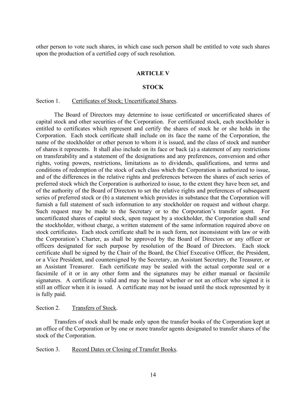 14 other person to vote such shares, in which case such person shall be entitled to vote such shares upon the production of a certified copy of such resolution. ARTICLE V STOCK Section 1. Certificates of Stock; Uncertificated Shares. The Board of Directors may determine to issue certificated or uncertificated shares of capital stock and other securities of the Corporation. For certificated stock, each stockholder is entitled to certificates which represent and certify the shares of stock he or she holds in the Corporation. Each stock certificate shall include on its face the name of the Corporation, the name of the stockholder or other person to whom it is issued, and the class of stock and number of shares it represents. It shall also include on its face or back (a) a statement of any restrictions on transferability and a statement of the designations and any preferences, conversion and other rights, voting powers, restrictions, limitations as to dividends, qualifications, and terms and conditions of redemption of the stock of each class which the Corporation is authorized to issue, and of the differences in the relative rights and preferences between the shares of each series of preferred stock which the Corporation is authorized to issue, to the extent they have been set, and of the authority of the Board of Directors to set the relative rights and preferences of subsequent series of preferred stock or (b) a statement which provides in substance that the Corporation will furnish a full statement of such information to any stockholder on request and without charge. Such request may be made to the Secretary or to the Corporation’s transfer agent. For uncertificated shares of capital stock, upon request by a stockholder, the Corporation shall send the stockholder, without charge, a written statement of the same information required above on stock certificates. Each stock certificate shall be in such form, not inconsistent with law or with the Corporation’s Charter, as shall be approved by the Board of Directors or any officer or officers designated for such purpose by resolution of the Board of Directors. Each stock certificate shall be signed by the Chair of the Board, the Chief Executive Officer, the President, or a Vice President, and countersigned by the Secretary, an Assistant Secretary, the Treasurer, or an Assistant Treasurer. Each certificate may be sealed with the actual corporate seal or a facsimile of it or in any other form and the signatures may be either manual or facsimile signatures. A certificate is valid and may be issued whether or not an officer who signed it is still an officer when it is issued. A certificate may not be issued until the stock represented by it is fully paid. Section 2. Transfers of Stock. Transfers of stock shall be made only upon the transfer books of the Corporation kept at an office of the Corporation or by one or more transfer agents designated to transfer shares of the stock of the Corporation. Section 3. Record Dates or Closing of Transfer Books.