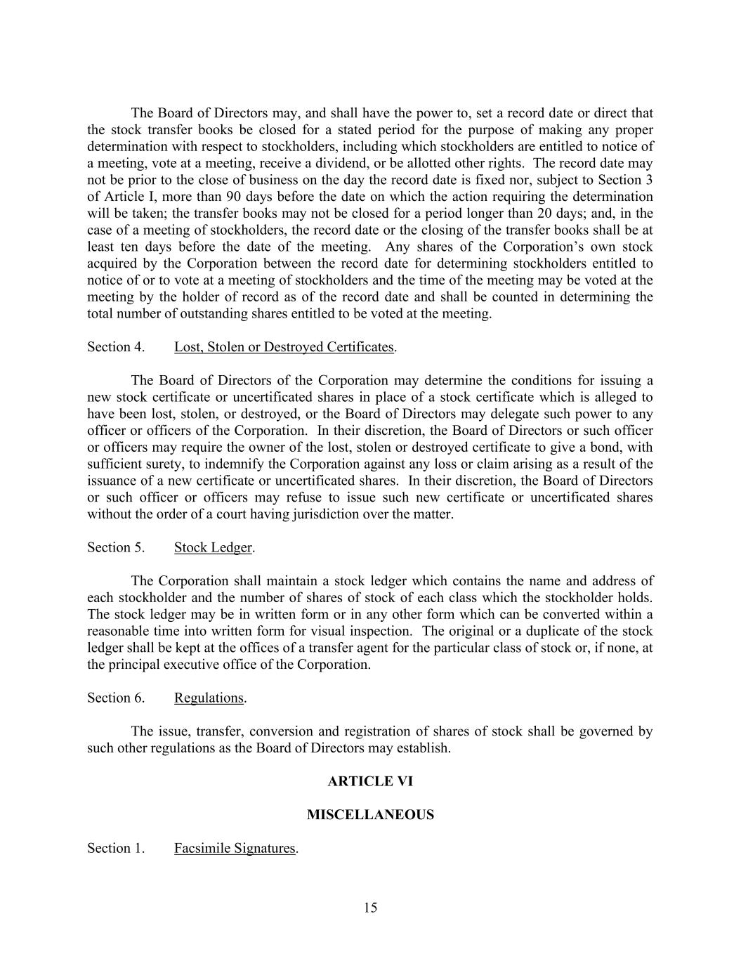 15 The Board of Directors may, and shall have the power to, set a record date or direct that the stock transfer books be closed for a stated period for the purpose of making any proper determination with respect to stockholders, including which stockholders are entitled to notice of a meeting, vote at a meeting, receive a dividend, or be allotted other rights. The record date may not be prior to the close of business on the day the record date is fixed nor, subject to Section 3 of Article I, more than 90 days before the date on which the action requiring the determination will be taken; the transfer books may not be closed for a period longer than 20 days; and, in the case of a meeting of stockholders, the record date or the closing of the transfer books shall be at least ten days before the date of the meeting. Any shares of the Corporation’s own stock acquired by the Corporation between the record date for determining stockholders entitled to notice of or to vote at a meeting of stockholders and the time of the meeting may be voted at the meeting by the holder of record as of the record date and shall be counted in determining the total number of outstanding shares entitled to be voted at the meeting. Section 4. Lost, Stolen or Destroyed Certificates. The Board of Directors of the Corporation may determine the conditions for issuing a new stock certificate or uncertificated shares in place of a stock certificate which is alleged to have been lost, stolen, or destroyed, or the Board of Directors may delegate such power to any officer or officers of the Corporation. In their discretion, the Board of Directors or such officer or officers may require the owner of the lost, stolen or destroyed certificate to give a bond, with sufficient surety, to indemnify the Corporation against any loss or claim arising as a result of the issuance of a new certificate or uncertificated shares. In their discretion, the Board of Directors or such officer or officers may refuse to issue such new certificate or uncertificated shares without the order of a court having jurisdiction over the matter. Section 5. Stock Ledger. The Corporation shall maintain a stock ledger which contains the name and address of each stockholder and the number of shares of stock of each class which the stockholder holds. The stock ledger may be in written form or in any other form which can be converted within a reasonable time into written form for visual inspection. The original or a duplicate of the stock ledger shall be kept at the offices of a transfer agent for the particular class of stock or, if none, at the principal executive office of the Corporation. Section 6. Regulations. The issue, transfer, conversion and registration of shares of stock shall be governed by such other regulations as the Board of Directors may establish. ARTICLE VI MISCELLANEOUS Section 1. Facsimile Signatures.