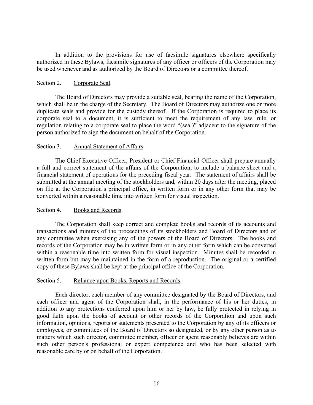 16 In addition to the provisions for use of facsimile signatures elsewhere specifically authorized in these Bylaws, facsimile signatures of any officer or officers of the Corporation may be used whenever and as authorized by the Board of Directors or a committee thereof. Section 2. Corporate Seal. The Board of Directors may provide a suitable seal, bearing the name of the Corporation, which shall be in the charge of the Secretary. The Board of Directors may authorize one or more duplicate seals and provide for the custody thereof. If the Corporation is required to place its corporate seal to a document, it is sufficient to meet the requirement of any law, rule, or regulation relating to a corporate seal to place the word “(seal)” adjacent to the signature of the person authorized to sign the document on behalf of the Corporation. Section 3. Annual Statement of Affairs. The Chief Executive Officer, President or Chief Financial Officer shall prepare annually a full and correct statement of the affairs of the Corporation, to include a balance sheet and a financial statement of operations for the preceding fiscal year. The statement of affairs shall be submitted at the annual meeting of the stockholders and, within 20 days after the meeting, placed on file at the Corporation’s principal office, in written form or in any other form that may be converted within a reasonable time into written form for visual inspection. Section 4. Books and Records. The Corporation shall keep correct and complete books and records of its accounts and transactions and minutes of the proceedings of its stockholders and Board of Directors and of any committee when exercising any of the powers of the Board of Directors. The books and records of the Corporation may be in written form or in any other form which can be converted within a reasonable time into written form for visual inspection. Minutes shall be recorded in written form but may be maintained in the form of a reproduction. The original or a certified copy of these Bylaws shall be kept at the principal office of the Corporation. Section 5. Reliance upon Books, Reports and Records. Each director, each member of any committee designated by the Board of Directors, and each officer and agent of the Corporation shall, in the performance of his or her duties, in addition to any protections conferred upon him or her by law, be fully protected in relying in good faith upon the books of account or other records of the Corporation and upon such information, opinions, reports or statements presented to the Corporation by any of its officers or employees, or committees of the Board of Directors so designated, or by any other person as to matters which such director, committee member, officer or agent reasonably believes are within such other person's professional or expert competence and who has been selected with reasonable care by or on behalf of the Corporation.
