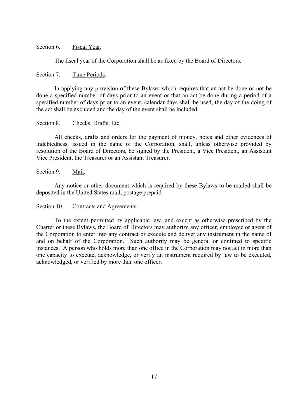 17 Section 6. Fiscal Year. The fiscal year of the Corporation shall be as fixed by the Board of Directors. Section 7. Time Periods. In applying any provision of these Bylaws which requires that an act be done or not be done a specified number of days prior to an event or that an act be done during a period of a specified number of days prior to an event, calendar days shall be used, the day of the doing of the act shall be excluded and the day of the event shall be included. Section 8. Checks, Drafts, Etc. All checks, drafts and orders for the payment of money, notes and other evidences of indebtedness, issued in the name of the Corporation, shall, unless otherwise provided by resolution of the Board of Directors, be signed by the President, a Vice President, an Assistant Vice President, the Treasurer or an Assistant Treasurer. Section 9. Mail. Any notice or other document which is required by these Bylaws to be mailed shall be deposited in the United States mail, postage prepaid. Section 10. Contracts and Agreements. To the extent permitted by applicable law, and except as otherwise prescribed by the Charter or these Bylaws, the Board of Directors may authorize any officer, employee or agent of the Corporation to enter into any contract or execute and deliver any instrument in the name of and on behalf of the Corporation. Such authority may be general or confined to specific instances. A person who holds more than one office in the Corporation may not act in more than one capacity to execute, acknowledge, or verify an instrument required by law to be executed, acknowledged, or verified by more than one officer.
