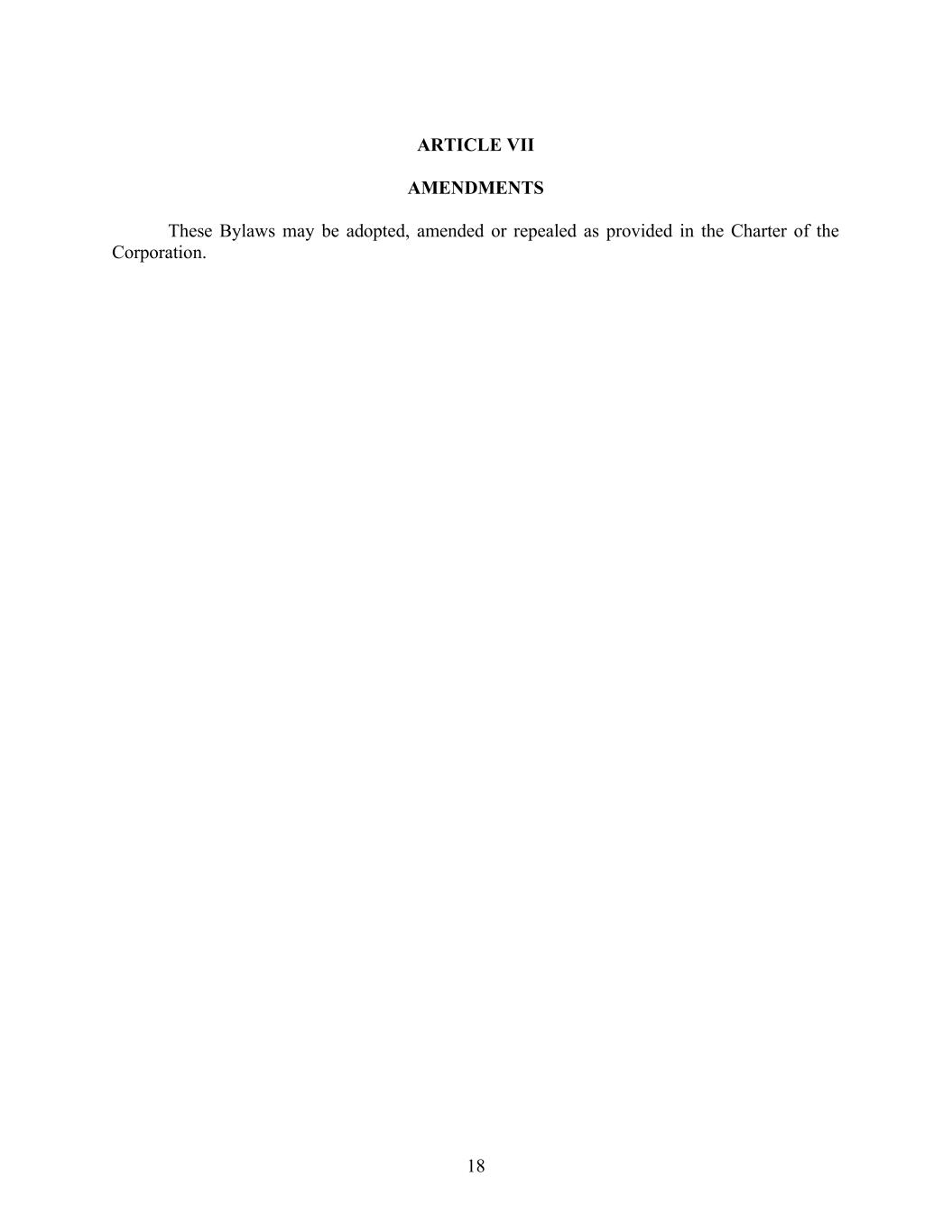 18 ARTICLE VII AMENDMENTS These Bylaws may be adopted, amended or repealed as provided in the Charter of the Corporation.