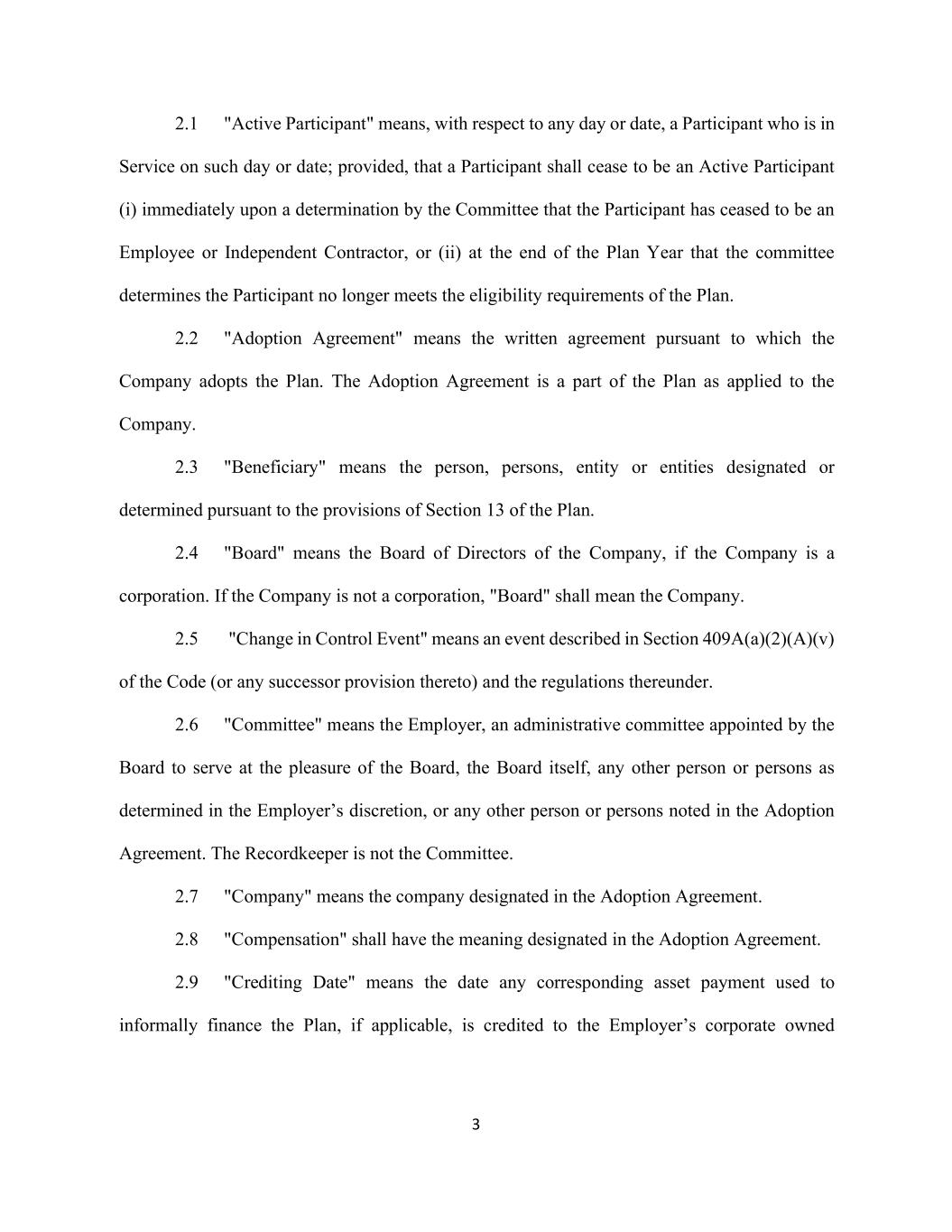 3 DD2326-10 2.1 "Active Participant" means, with respect to any day or date, a Participant who is in Service on such day or date; provided, that a Participant shall cease to be an Active Participant (i) immediately upon a determination by the Committee that the Participant has ceased to be an Employee or Independent Contractor, or (ii) at the end of the Plan Year that the committee determines the Participant no longer meets the eligibility requirements of the Plan. 2.2 "Adoption Agreement" means the written agreement pursuant to which the Company adopts the Plan. The Adoption Agreement is a part of the Plan as applied to the Company. 2.3 "Beneficiary" means the person, persons, entity or entities designated or determined pursuant to the provisions of Section 13 of the Plan. 2.4 "Board" means the Board of Directors of the Company, if the Company is a corporation. If the Company is not a corporation, "Board" shall mean the Company. 2.5 "Change in Control Event" means an event described in Section 409A(a)(2)(A)(v) of the Code (or any successor provision thereto) and the regulations thereunder. 2.6 "Committee" means the Employer, an administrative committee appointed by the Board to serve at the pleasure of the Board, the Board itself, any other person or persons as determined in the Employer’s discretion, or any other person or persons noted in the Adoption Agreement. The Recordkeeper is not the Committee. 2.7 "Company" means the company designated in the Adoption Agreement. 2.8 "Compensation" shall have the meaning designated in the Adoption Agreement. 2.9 "Crediting Date" means the date any corresponding asset payment used to informally finance the Plan, if applicable, is credited to the Employer’s corporate owned
