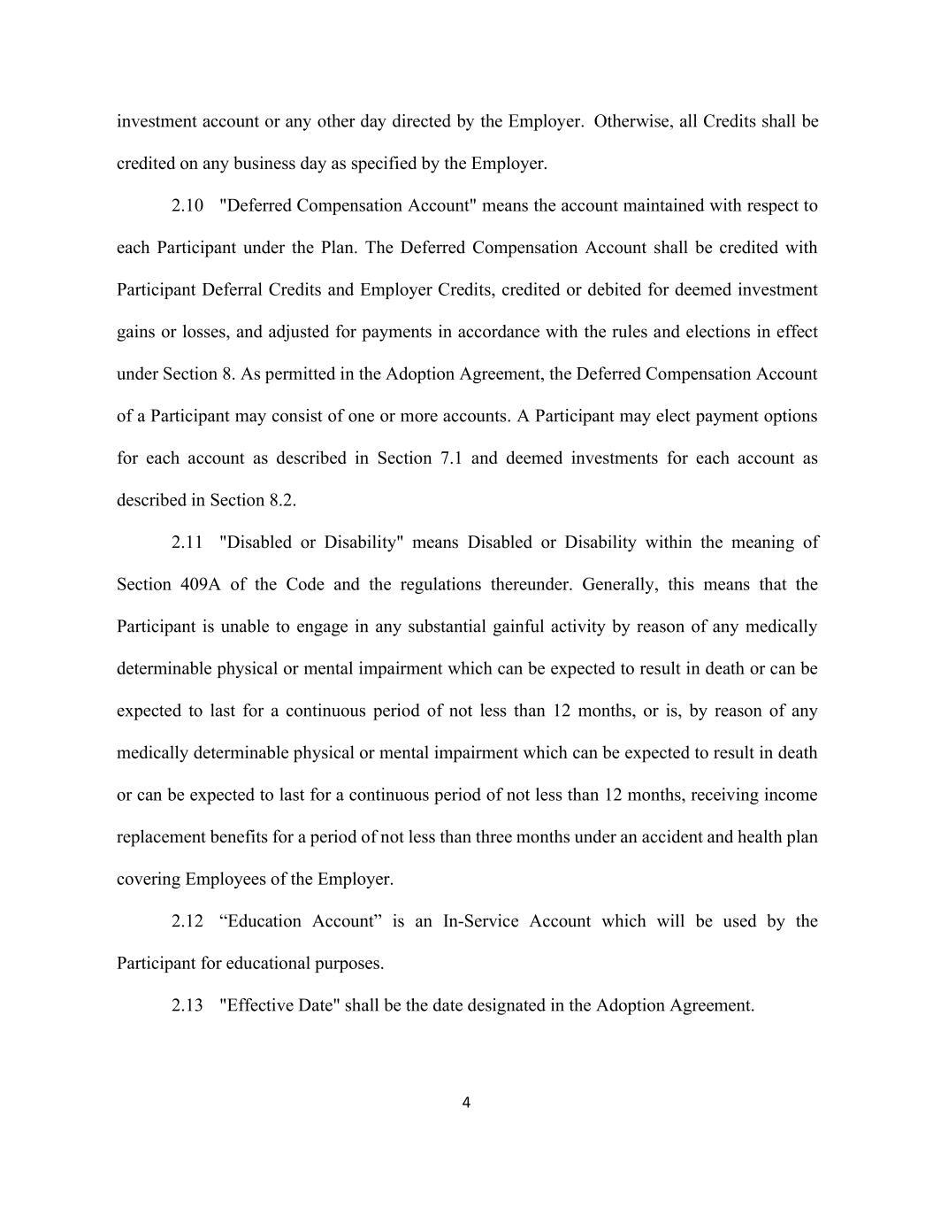 4 DD2326-10 credited on any business day as specified by the Employer. 2.10 "Deferred Compensation Account" means the account maintained with respect to each Participant under the Plan. The Deferred Compensation Account shall be credited with Participant Deferral Credits and Employer Credits, credited or debited for deemed investment gains or losses, and adjusted for payments in accordance with the rules and elections in effect under Section 8. As permitted in the Adoption Agreement, the Deferred Compensation Account of a Participant may consist of one or more accounts. A Participant may elect payment options for each account as described in Section 7.1 and deemed investments for each account as described in Section 8.2. 2.11 "Disabled or Disability" means Disabled or Disability within the meaning of Section 409A of the Code and the regulations thereunder. Generally, this means that the Participant is unable to engage in any substantial gainful activity by reason of any medically determinable physical or mental impairment which can be expected to result in death or can be expected to last for a continuous period of not less than 12 months, or is, by reason of any medically determinable physical or mental impairment which can be expected to result in death or can be expected to last for a continuous period of not less than 12 months, receiving income replacement benefits for a period of not less than three months under an accident and health plan covering Employees of the Employer. 2.12 “Education Account” is an In-Service Account which will be used by the Participant for educational purposes. 2.13 "Effective Date" shall be the date designated in the Adoption Agreement.