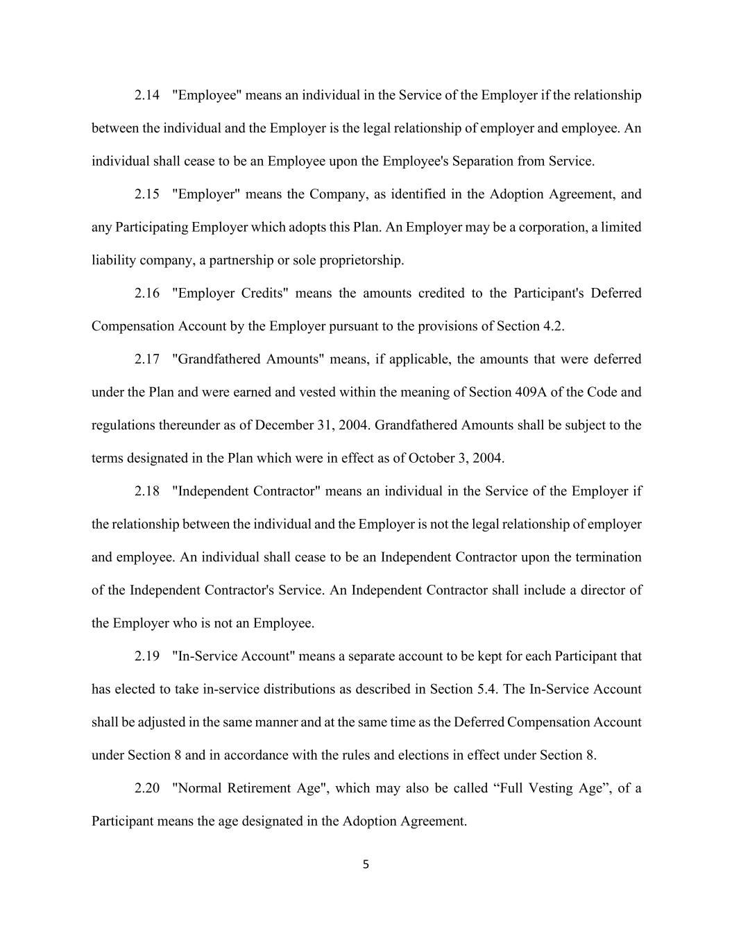 5 DD2326-10 2.14 "Employee" means an individual in the Service of the Employer if the relationship between the individual and the Employer is the legal relationship of employer and employee. An individual shall cease to be an Employee upon the Employee's Separation from Service. 2.15 "Employer" means the Company, as identified in the Adoption Agreement, and any Participating Employer which adopts this Plan. An Employer may be a corporation, a limited liability company, a partnership or sole proprietorship. 2.16 "Employer Credits" means the amounts credited to the Participant's Deferred Compensation Account by the Employer pursuant to the provisions of Section 4.2. 2.17 "Grandfathered Amounts" means, if applicable, the amounts that were deferred under the Plan and were earned and vested within the meaning of Section 409A of the Code and regulations thereunder as of December 31, 2004. Grandfathered Amounts shall be subject to the terms designated in the Plan which were in effect as of October 3, 2004. 2.18 "Independent Contractor" means an individual in the Service of the Employer if the relationship between the individual and the Employer is not the legal relationship of employer and employee. An individual shall cease to be an Independent Contractor upon the termination of the Independent Contractor's Service. An Independent Contractor shall include a director of the Employer who is not an Employee. 2.19 "In-Service Account" means a separate account to be kept for each Participant that has elected to take in-service distributions as described in Section 5.4. The In-Service Account shall be adjusted in the same manner and at the same time as the Deferred Compensation Account under Section 8 and in accordance with the rules and elections in effect under Section 8. 2.20 "Normal Retirement Age", which may also be called “Full Vesting Age”, of a Participant means the age designated in the Adoption Agreement.