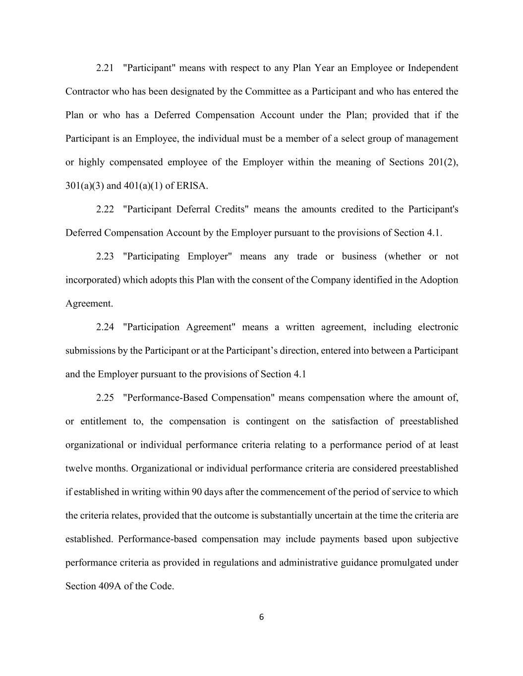 6 DD2326-10 2.21 "Participant" means with respect to any Plan Year an Employee or Independent Contractor who has been designated by the Committee as a Participant and who has entered the Plan or who has a Deferred Compensation Account under the Plan; provided that if the Participant is an Employee, the individual must be a member of a select group of management or highly compensated employee of the Employer within the meaning of Sections 201(2), 301(a)(3) and 401(a)(1) of ERISA. 2.22 "Participant Deferral Credits" means the amounts credited to the Participant's Deferred Compensation Account by the Employer pursuant to the provisions of Section 4.1. 2.23 "Participating Employer" means any trade or business (whether or not incorporated) which adopts this Plan with the consent of the Company identified in the Adoption Agreement. 2.24 "Participation Agreement" means a written agreement, including electronic submissions by the Participant or at the Participant’s direction, entered into between a Participant and the Employer pursuant to the provisions of Section 4.1 2.25 "Performance-Based Compensation" means compensation where the amount of, or entitlement to, the compensation is contingent on the satisfaction of preestablished organizational or individual performance criteria relating to a performance period of at least twelve months. Organizational or individual performance criteria are considered preestablished if established in writing within 90 days after the commencement of the period of service to which the criteria relates, provided that the outcome is substantially uncertain at the time the criteria are established. Performance-based compensation may include payments based upon subjective performance criteria as provided in regulations and administrative guidance promulgated under Section 409A of the Code.