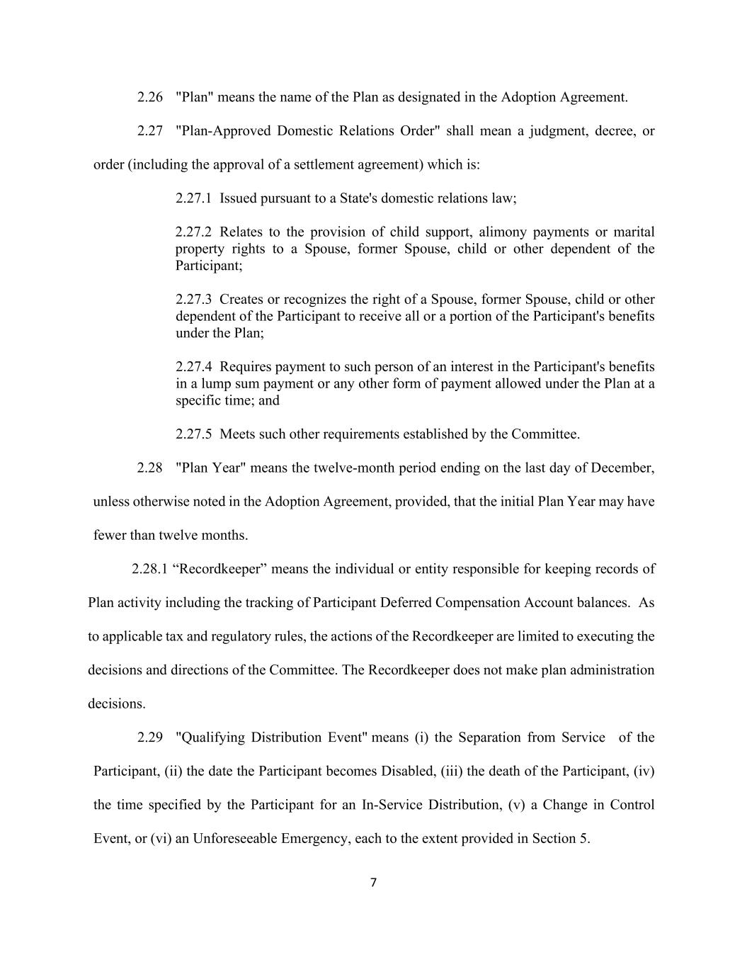 7 DD2326-10 2.26 "Plan" means the name of the Plan as designated in the Adoption Agreement. 2.27 "Plan-Approved Domestic Relations Order" shall mean a judgment, decree, or order (including the approval of a settlement agreement) which is: 2.27.1 Issued pursuant to a State's domestic relations law; 2.27.2 Relates to the provision of child support, alimony payments or marital property rights to a Spouse, former Spouse, child or other dependent of the Participant; 2.27.3 Creates or recognizes the right of a Spouse, former Spouse, child or other dependent of the Participant to receive all or a portion of the Participant's benefits under the Plan; 2.27.4 Requires payment to such person of an interest in the Participant's benefits in a lump sum payment or any other form of payment allowed under the Plan at a specific time; and 2.27.5 Meets such other requirements established by the Committee. 2.28 "Plan Year" means the twelve-month period ending on the last day of December, unless otherwise noted in the Adoption Agreement, provided, that the initial Plan Year may have fewer than twelve months. 2.28.1 “Recordkeeper” means the individual or entity responsible for keeping records of Plan activity including the tracking of Participant Deferred Compensation Account balances. As to applicable tax and regulatory rules, the actions of the Recordkeeper are limited to executing the decisions and directions of the Committee. The Recordkeeper does not make plan administration decisions. 2.29 "Qualifying Distribution Event" means (i) the Separation from Service of the Participant, (ii) the date the Participant becomes Disabled, (iii) the death of the Participant, (iv) the time specified by the Participant for an In-Service Distribution, (v) a Change in Control Event, or (vi) an Unforeseeable Emergency, each to the extent provided in Section 5.