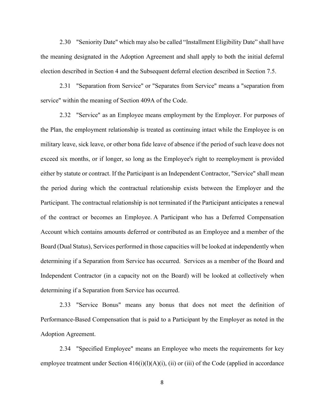 8 DD2326-10 2.30 "Seniority Date" which may also be called “Installment Eligibility Date” shall have the meaning designated in the Adoption Agreement and shall apply to both the initial deferral election described in Section 4 and the Subsequent deferral election described in Section 7.5. 2.31 "Separation from Service" or "Separates from Service" means a "separation from service" within the meaning of Section 409A of the Code. 2.32 "Service" as an Employee means employment by the Employer. For purposes of the Plan, the employment relationship is treated as continuing intact while the Employee is on military leave, sick leave, or other bona fide leave of absence if the period of such leave does not exceed six months, or if longer, so long as the Employee's right to reemployment is provided either by statute or contract. If the Participant is an Independent Contractor, "Service" shall mean the period during which the contractual relationship exists between the Employer and the Participant. The contractual relationship is not terminated if the Participant anticipates a renewal of the contract or becomes an Employee. A Participant who has a Deferred Compensation Account which contains amounts deferred or contributed as an Employee and a member of the Board (Dual Status), Services performed in those capacities will be looked at independently when determining if a Separation from Service has occurred. Services as a member of the Board and Independent Contractor (in a capacity not on the Board) will be looked at collectively when determining if a Separation from Service has occurred. 2.33 "Service Bonus" means any bonus that does not meet the definition of Performance-Based Compensation that is paid to a Participant by the Employer as noted in the Adoption Agreement. 2.34 "Specified Employee" means an Employee who meets the requirements for key employee treatment under Section 416(i)(l)(A)(i), (ii) or (iii) of the Code (applied in accordance