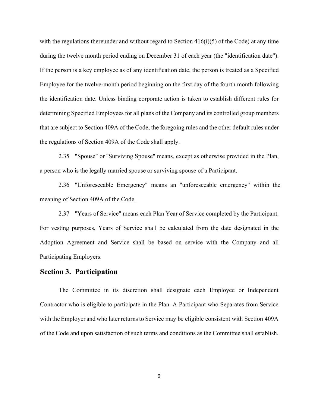 9 DD2326-10 with the regulations thereunder and without regard to Section 416(i)(5) of the Code) at any time during the twelve month period ending on December 31 of each year (the "identification date"). If the person is a key employee as of any identification date, the person is treated as a Specified Employee for the twelve-month period beginning on the first day of the fourth month following the identification date. Unless binding corporate action is taken to establish different rules for determining Specified Employees for all plans of the Company and its controlled group members that are subject to Section 409A of the Code, the foregoing rules and the other default rules under the regulations of Section 409A of the Code shall apply. 2.35 "Spouse" or ''Surviving Spouse" means, except as otherwise provided in the Plan, a person who is the legally married spouse or surviving spouse of a Participant. 2.36 "Unforeseeable Emergency" means an "unforeseeable emergency" within the meaning of Section 409A of the Code. 2.37 "Years of Service" means each Plan Year of Service completed by the Participant. For vesting purposes, Years of Service shall be calculated from the date designated in the Adoption Agreement and Service shall be based on service with the Company and all Participating Employers. Section 3. Participation The Committee in its discretion shall designate each Employee or Independent Contractor who is eligible to participate in the Plan. A Participant who Separates from Service with the Employer and who later returns to Service may be eligible consistent with Section 409A of the Code and upon satisfaction of such terms and conditions as the Committee shall establish.