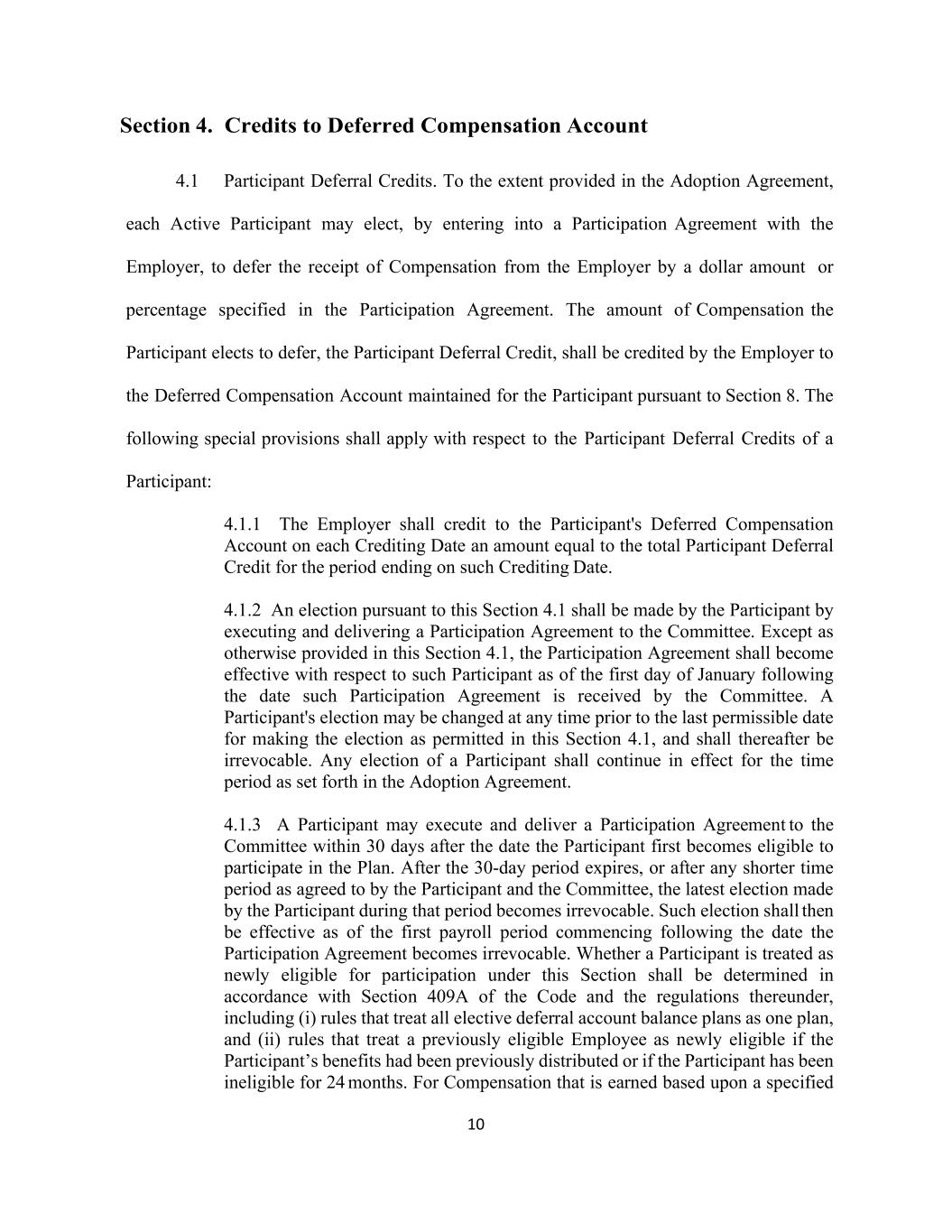 10 DD2326-10 Section 4. Credits to Deferred Compensation Account 4.1 Participant Deferral Credits. To the extent provided in the Adoption Agreement, each Active Participant may elect, by entering into a Participation Agreement with the Employer, to defer the receipt of Compensation from the Employer by a dollar amount or percentage specified in the Participation Agreement. The amount of Compensation the Participant elects to defer, the Participant Deferral Credit, shall be credited by the Employer to the Deferred Compensation Account maintained for the Participant pursuant to Section 8. The following special provisions shall apply with respect to the Participant Deferral Credits of a Participant: 4.1.1 The Employer shall credit to the Participant's Deferred Compensation Account on each Crediting Date an amount equal to the total Participant Deferral Credit for the period ending on such Crediting Date. 4.1.2 An election pursuant to this Section 4.1 shall be made by the Participant by executing and delivering a Participation Agreement to the Committee. Except as otherwise provided in this Section 4.1, the Participation Agreement shall become effective with respect to such Participant as of the first day of January following the date such Participation Agreement is received by the Committee. A Participant's election may be changed at any time prior to the last permissible date for making the election as permitted in this Section 4.1, and shall thereafter be irrevocable. Any election of a Participant shall continue in effect for the time period as set forth in the Adoption Agreement. 4.1.3 A Participant may execute and deliver a Participation Agreement to the Committee within 30 days after the date the Participant first becomes eligible to participate in the Plan. After the 30-day period expires, or after any shorter time period as agreed to by the Participant and the Committee, the latest election made by the Participant during that period becomes irrevocable. Such election shall then be effective as of the first payroll period commencing following the date the Participation Agreement becomes irrevocable. Whether a Participant is treated as newly eligible for participation under this Section shall be determined in accordance with Section 409A of the Code and the regulations thereunder, including (i) rules that treat all elective deferral account balance plans as one plan, and (ii) rules that treat a previously eligible Employee as newly eligible if the Participant’s benefits had been previously distributed or if the Participant has been ineligible for 24 months. For Compensation that is earned based upon a specified