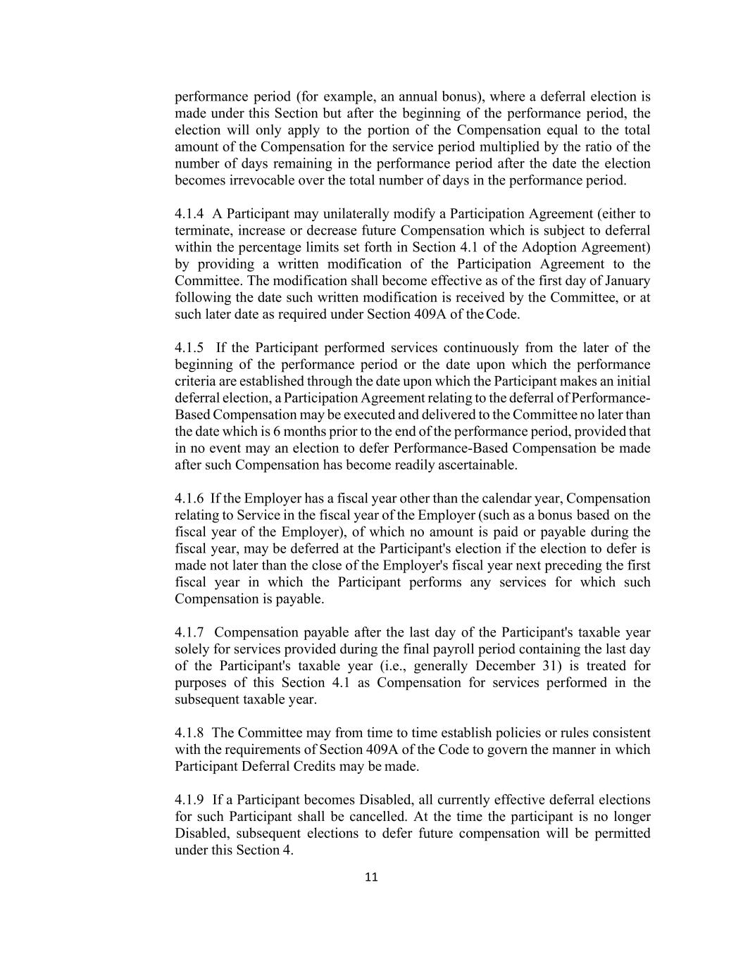 11 DD2326-10 performance period (for example, an annual bonus), where a deferral election is made under this Section but after the beginning of the performance period, the election will only apply to the portion of the Compensation equal to the total amount of the Compensation for the service period multiplied by the ratio of the number of days remaining in the performance period after the date the election becomes irrevocable over the total number of days in the performance period. 4.1.4 A Participant may unilaterally modify a Participation Agreement (either to terminate, increase or decrease future Compensation which is subject to deferral within the percentage limits set forth in Section 4.1 of the Adoption Agreement) by providing a written modification of the Participation Agreement to the Committee. The modification shall become effective as of the first day of January following the date such written modification is received by the Committee, or at such later date as required under Section 409A of the Code. 4.1.5 If the Participant performed services continuously from the later of the beginning of the performance period or the date upon which the performance criteria are established through the date upon which the Participant makes an initial deferral election, a Participation Agreement relating to the deferral of Performance- Based Compensation may be executed and delivered to the Committee no later than the date which is 6 months prior to the end of the performance period, provided that in no event may an election to defer Performance-Based Compensation be made after such Compensation has become readily ascertainable. 4.1.6 If the Employer has a fiscal year other than the calendar year, Compensation relating to Service in the fiscal year of the Employer (such as a bonus based on the fiscal year of the Employer), of which no amount is paid or payable during the fiscal year, may be deferred at the Participant's election if the election to defer is made not later than the close of the Employer's fiscal year next preceding the first fiscal year in which the Participant performs any services for which such Compensation is payable. 4.1.7 Compensation payable after the last day of the Participant's taxable year solely for services provided during the final payroll period containing the last day of the Participant's taxable year (i.e., generally December 31) is treated for purposes of this Section 4.1 as Compensation for services performed in the subsequent taxable year. 4.1.8 The Committee may from time to time establish policies or rules consistent with the requirements of Section 409A of the Code to govern the manner in which Participant Deferral Credits may be made. 4.1.9 If a Participant becomes Disabled, all currently effective deferral elections for such Participant shall be cancelled. At the time the participant is no longer Disabled, subsequent elections to defer future compensation will be permitted under this Section 4.