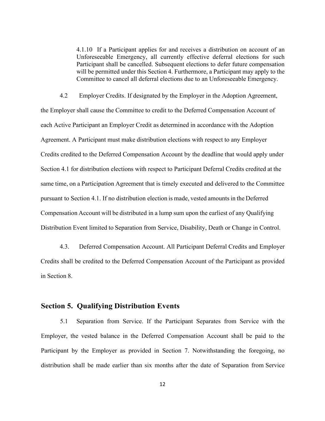 12 DD2326-10 4.1.10 If a Participant applies for and receives a distribution on account of an Unforeseeable Emergency, all currently effective deferral elections for such Participant shall be cancelled. Subsequent elections to defer future compensation will be permitted under this Section 4. Furthermore, a Participant may apply to the Committee to cancel all deferral elections due to an Unforeseeable Emergency. 4.2 Employer Credits. If designated by the Employer in the Adoption Agreement, the Employer shall cause the Committee to credit to the Deferred Compensation Account of each Active Participant an Employer Credit as determined in accordance with the Adoption Agreement. A Participant must make distribution elections with respect to any Employer Credits credited to the Deferred Compensation Account by the deadline that would apply under Section 4.1 for distribution elections with respect to Participant Deferral Credits credited at the same time, on a Participation Agreement that is timely executed and delivered to the Committee pursuant to Section 4.1. If no distribution election is made, vested amounts in the Deferred Compensation Account will be distributed in a lump sum upon the earliest of any Qualifying Distribution Event limited to Separation from Service, Disability, Death or Change in Control. 4.3. Deferred Compensation Account. All Participant Deferral Credits and Employer Credits shall be credited to the Deferred Compensation Account of the Participant as provided in Section 8. Section 5. Qualifying Distribution Events 5.1 Separation from Service. If the Participant Separates from Service with the Employer, the vested balance in the Deferred Compensation Account shall be paid to the Participant by the Employer as provided in Section 7. Notwithstanding the foregoing, no distribution shall be made earlier than six months after the date of Separation from Service