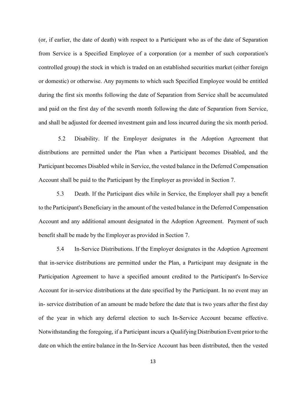 13 DD2326-10 (or, if earlier, the date of death) with respect to a Participant who as of the date of Separation from Service is a Specified Employee of a corporation (or a member of such corporation's controlled group) the stock in which is traded on an established securities market (either foreign or domestic) or otherwise. Any payments to which such Specified Employee would be entitled during the first six months following the date of Separation from Service shall be accumulated and paid on the first day of the seventh month following the date of Separation from Service, and shall be adjusted for deemed investment gain and loss incurred during the six month period. 5.2 Disability. If the Employer designates in the Adoption Agreement that distributions are permitted under the Plan when a Participant becomes Disabled, and the Participant becomes Disabled while in Service, the vested balance in the Deferred Compensation Account shall be paid to the Participant by the Employer as provided in Section 7. 5.3 Death. If the Participant dies while in Service, the Employer shall pay a benefit to the Participant's Beneficiary in the amount of the vested balance in the Deferred Compensation Account and any additional amount designated in the Adoption Agreement. Payment of such benefit shall be made by the Employer as provided in Section 7. 5.4 In-Service Distributions. If the Employer designates in the Adoption Agreement that in-service distributions are permitted under the Plan, a Participant may designate in the Participation Agreement to have a specified amount credited to the Participant's In-Service Account for in-service distributions at the date specified by the Participant. In no event may an in- service distribution of an amount be made before the date that is two years after the first day of the year in which any deferral election to such In-Service Account became effective. Notwithstanding the foregoing, if a Participant incurs a Qualifying Distribution Event prior to the date on which the entire balance in the In-Service Account has been distributed, then the vested