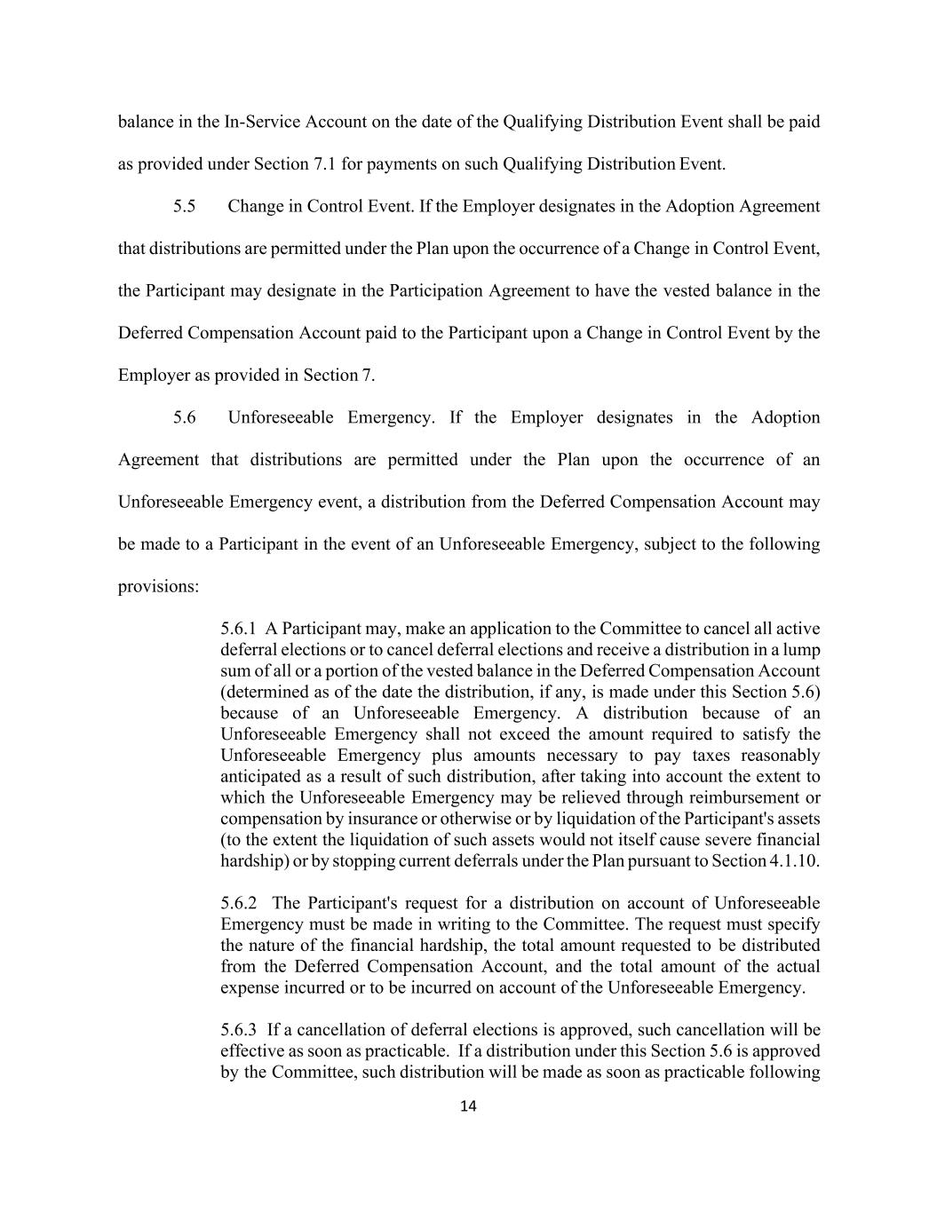 14 DD2326-10 balance in the In-Service Account on the date of the Qualifying Distribution Event shall be paid as provided under Section 7.1 for payments on such Qualifying Distribution Event. 5.5 Change in Control Event. If the Employer designates in the Adoption Agreement that distributions are permitted under the Plan upon the occurrence of a Change in Control Event, the Participant may designate in the Participation Agreement to have the vested balance in the Deferred Compensation Account paid to the Participant upon a Change in Control Event by the Employer as provided in Section 7. 5.6 Unforeseeable Emergency. If the Employer designates in the Adoption Agreement that distributions are permitted under the Plan upon the occurrence of an Unforeseeable Emergency event, a distribution from the Deferred Compensation Account may be made to a Participant in the event of an Unforeseeable Emergency, subject to the following provisions: 5.6.1 A Participant may, make an application to the Committee to cancel all active deferral elections or to cancel deferral elections and receive a distribution in a lump sum of all or a portion of the vested balance in the Deferred Compensation Account (determined as of the date the distribution, if any, is made under this Section 5.6) because of an Unforeseeable Emergency. A distribution because of an Unforeseeable Emergency shall not exceed the amount required to satisfy the Unforeseeable Emergency plus amounts necessary to pay taxes reasonably anticipated as a result of such distribution, after taking into account the extent to which the Unforeseeable Emergency may be relieved through reimbursement or compensation by insurance or otherwise or by liquidation of the Participant's assets (to the extent the liquidation of such assets would not itself cause severe financial hardship) or by stopping current deferrals under the Plan pursuant to Section 4.1.10. 5.6.2 The Participant's request for a distribution on account of Unforeseeable Emergency must be made in writing to the Committee. The request must specify the nature of the financial hardship, the total amount requested to be distributed from the Deferred Compensation Account, and the total amount of the actual expense incurred or to be incurred on account of the Unforeseeable Emergency. 5.6.3 If a cancellation of deferral elections is approved, such cancellation will be effective as soon as practicable. If a distribution under this Section 5.6 is approved by the Committee, such distribution will be made as soon as practicable following