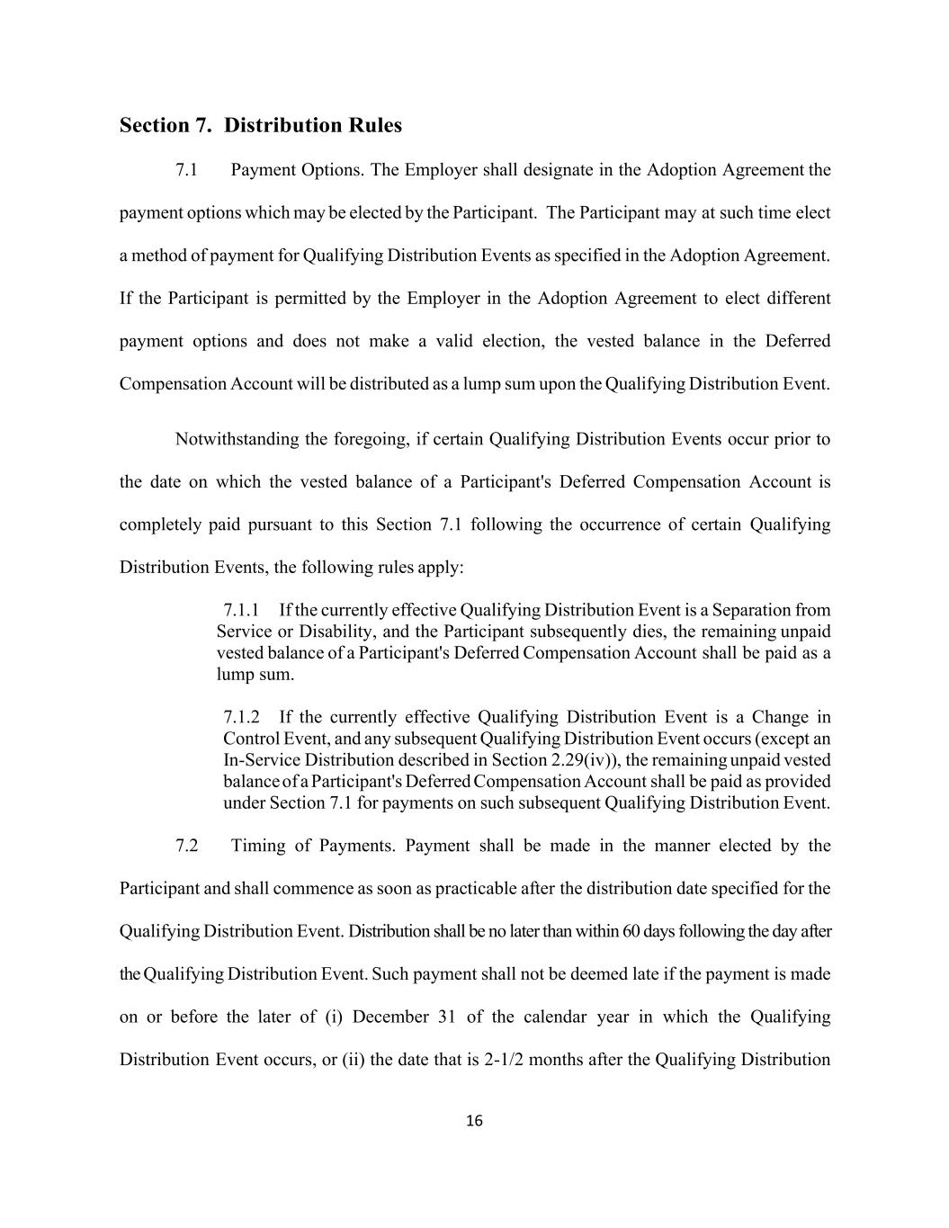 16 DD2326-10 Section 7. Distribution Rules 7.1 Payment Options. The Employer shall designate in the Adoption Agreement the payment options which may be elected by the Participant. The Participant may at such time elect a method of payment for Qualifying Distribution Events as specified in the Adoption Agreement. If the Participant is permitted by the Employer in the Adoption Agreement to elect different payment options and does not make a valid election, the vested balance in the Deferred Compensation Account will be distributed as a lump sum upon the Qualifying Distribution Event. Notwithstanding the foregoing, if certain Qualifying Distribution Events occur prior to the date on which the vested balance of a Participant's Deferred Compensation Account is completely paid pursuant to this Section 7.1 following the occurrence of certain Qualifying Distribution Events, the following rules apply: 7.1.1 If the currently effective Qualifying Distribution Event is a Separation from Service or Disability, and the Participant subsequently dies, the remaining unpaid vested balance of a Participant's Deferred Compensation Account shall be paid as a lump sum. 7.1.2 If the currently effective Qualifying Distribution Event is a Change in Control Event, and any subsequent Qualifying Distribution Event occurs (except an In-Service Distribution described in Section 2.29(iv)), the remaining unpaid vested balanceof a Participant's Deferred Compensation Account shall be paid as provided under Section 7.1 for payments on such subsequent Qualifying Distribution Event. 7.2 Timing of Payments. Payment shall be made in the manner elected by the Participant and shall commence as soon as practicable after the distribution date specified for the Qualifying Distribution Event. Distribution shall be no later than within 60 days following the day after the Qualifying Distribution Event. Such payment shall not be deemed late if the payment is made on or before the later of (i) December 31 of the calendar year in which the Qualifying Distribution Event occurs, or (ii) the date that is 2-1/2 months after the Qualifying Distribution