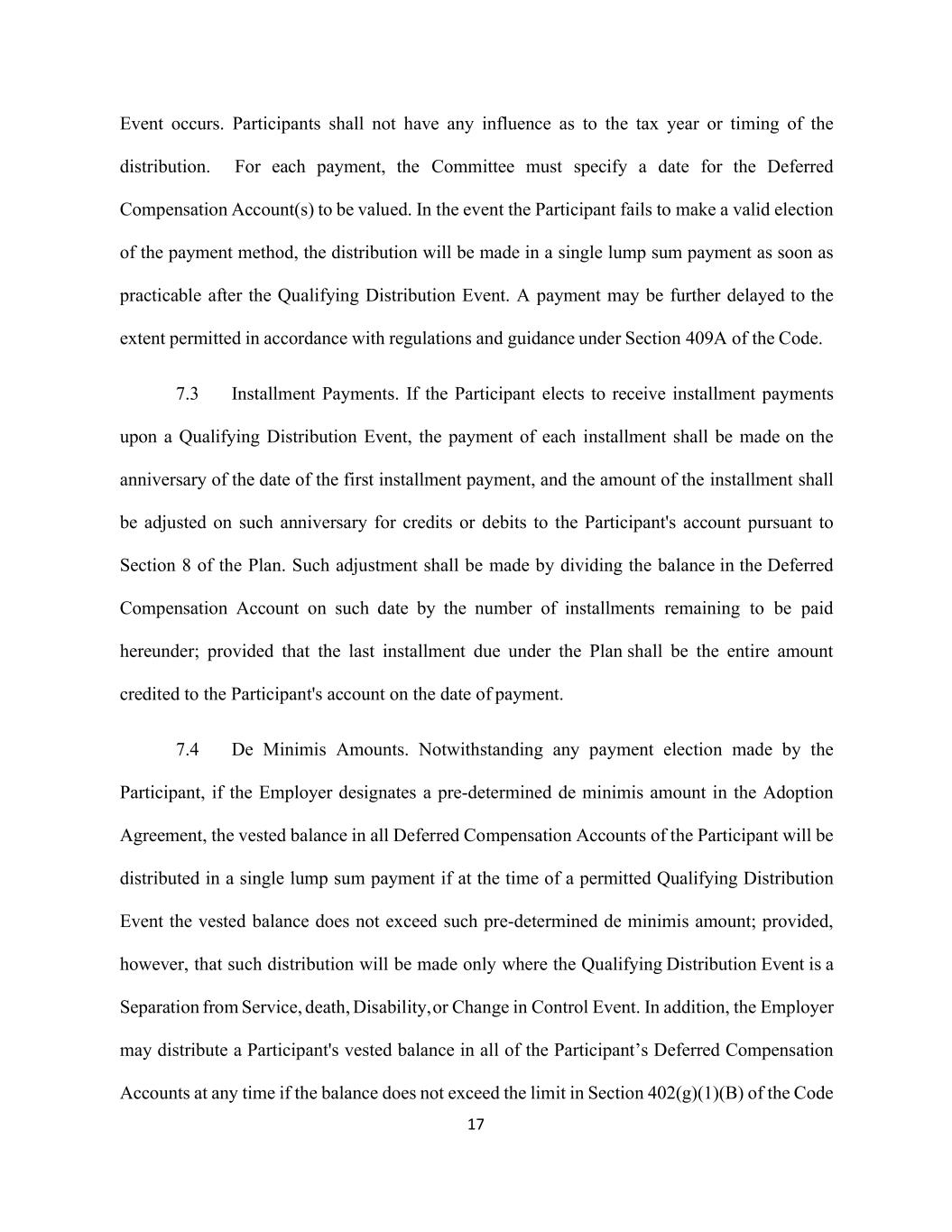 17 DD2326-10 Event occurs. Participants shall not have any influence as to the tax year or timing of the distribution. For each payment, the Committee must specify a date for the Deferred Compensation Account(s) to be valued. In the event the Participant fails to make a valid election of the payment method, the distribution will be made in a single lump sum payment as soon as practicable after the Qualifying Distribution Event. A payment may be further delayed to the extent permitted in accordance with regulations and guidance under Section 409A of the Code. 7.3 Installment Payments. If the Participant elects to receive installment payments upon a Qualifying Distribution Event, the payment of each installment shall be made on the anniversary of the date of the first installment payment, and the amount of the installment shall be adjusted on such anniversary for credits or debits to the Participant's account pursuant to Section 8 of the Plan. Such adjustment shall be made by dividing the balance in the Deferred Compensation Account on such date by the number of installments remaining to be paid hereunder; provided that the last installment due under the Plan shall be the entire amount credited to the Participant's account on the date of payment. 7.4 De Minimis Amounts. Notwithstanding any payment election made by the Participant, if the Employer designates a pre-determined de minimis amount in the Adoption Agreement, the vested balance in all Deferred Compensation Accounts of the Participant will be distributed in a single lump sum payment if at the time of a permitted Qualifying Distribution Event the vested balance does not exceed such pre-determined de minimis amount; provided, however, that such distribution will be made only where the Qualifying Distribution Event is a Separation from Service, death, Disability, or Change in Control Event. In addition, the Employer may distribute a Participant's vested balance in all of the Participant’s Deferred Compensation Accounts at any time if the balance does not exceed the limit in Section 402(g)(1)(B) of the Code