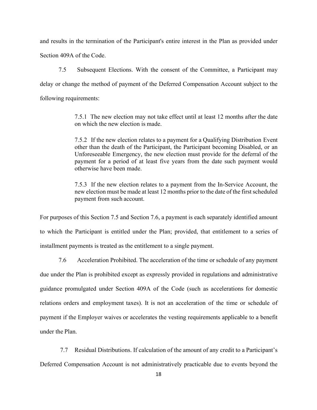 18 DD2326-10 and results in the termination of the Participant's entire interest in the Plan as provided under Section 409A of the Code. 7.5 Subsequent Elections. With the consent of the Committee, a Participant may delay or change the method of payment of the Deferred Compensation Account subject to the following requirements: 7.5.1 The new election may not take effect until at least 12 months after the date on which the new election is made. 7.5.2 If the new election relates to a payment for a Qualifying Distribution Event other than the death of the Participant, the Participant becoming Disabled, or an Unforeseeable Emergency, the new election must provide for the deferral of the payment for a period of at least five years from the date such payment would otherwise have been made. 7.5.3 If the new election relates to a payment from the In-Service Account, the new election must be made at least 12 months prior to the date of the first scheduled payment from such account. For purposes of this Section 7.5 and Section 7.6, a payment is each separately identified amount to which the Participant is entitled under the Plan; provided, that entitlement to a series of installment payments is treated as the entitlement to a single payment. 7.6 Acceleration Prohibited. The acceleration of the time or schedule of any payment due under the Plan is prohibited except as expressly provided in regulations and administrative guidance promulgated under Section 409A of the Code (such as accelerations for domestic relations orders and employment taxes). It is not an acceleration of the time or schedule of payment if the Employer waives or accelerates the vesting requirements applicable to a benefit under the Plan. 7.7 Residual Distributions. If calculation of the amount of any credit to a Participant’s Deferred Compensation Account is not administratively practicable due to events beyond the
