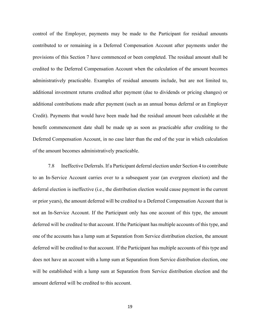 19 DD2326-10 control of the Employer, payments may be made to the Participant for residual amounts contributed to or remaining in a Deferred Compensation Account after payments under the provisions of this Section 7 have commenced or been completed. The residual amount shall be credited to the Deferred Compensation Account when the calculation of the amount becomes administratively practicable. Examples of residual amounts include, but are not limited to, additional investment returns credited after payment (due to dividends or pricing changes) or additional contributions made after payment (such as an annual bonus deferral or an Employer Credit). Payments that would have been made had the residual amount been calculable at the benefit commencement date shall be made up as soon as practicable after crediting to the Deferred Compensation Account, in no case later than the end of the year in which calculation of the amount becomes administratively practicable. 7.8 Ineffective Deferrals. If a Participant deferral election under Section 4 to contribute to an In-Service Account carries over to a subsequent year (an evergreen election) and the deferral election is ineffective (i.e., the distribution election would cause payment in the current or prior years), the amount deferred will be credited to a Deferred Compensation Account that is not an In-Service Account. If the Participant only has one account of this type, the amount deferred will be credited to that account. If the Participant has multiple accounts of this type, and one of the accounts has a lump sum at Separation from Service distribution election, the amount deferred will be credited to that account. If the Participant has multiple accounts of this type and does not have an account with a lump sum at Separation from Service distribution election, one will be established with a lump sum at Separation from Service distribution election and the amount deferred will be credited to this account.
