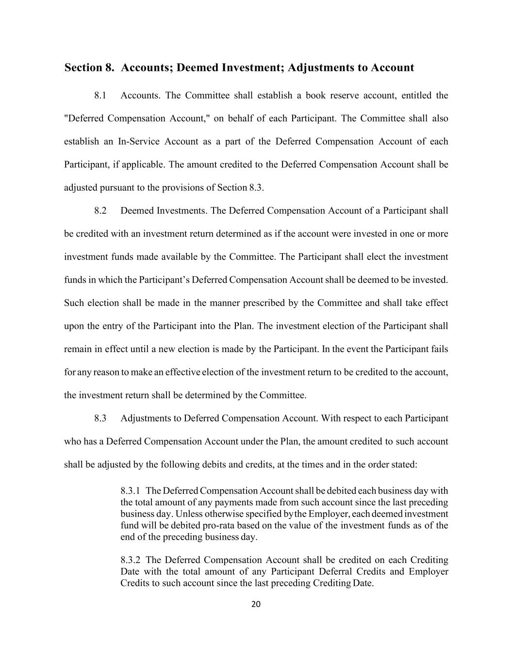 20 DD2326-10 Section 8. Accounts; Deemed Investment; Adjustments to Account 8.1 Accounts. The Committee shall establish a book reserve account, entitled the "Deferred Compensation Account," on behalf of each Participant. The Committee shall also establish an In-Service Account as a part of the Deferred Compensation Account of each Participant, if applicable. The amount credited to the Deferred Compensation Account shall be adjusted pursuant to the provisions of Section 8.3. 8.2 Deemed Investments. The Deferred Compensation Account of a Participant shall be credited with an investment return determined as if the account were invested in one or more investment funds made available by the Committee. The Participant shall elect the investment funds in which the Participant’s Deferred Compensation Account shall be deemed to be invested. Such election shall be made in the manner prescribed by the Committee and shall take effect upon the entry of the Participant into the Plan. The investment election of the Participant shall remain in effect until a new election is made by the Participant. In the event the Participant fails for any reason to make an effective election of the investment return to be credited to the account, the investment return shall be determined by the Committee. 8.3 Adjustments to Deferred Compensation Account. With respect to each Participant who has a Deferred Compensation Account under the Plan, the amount credited to such account shall be adjusted by the following debits and credits, at the times and in the order stated: 8.3.1 The Deferred Compensation Account shall be debited each business day with the total amount of any payments made from such account since the last preceding business day. Unless otherwise specified by the Employer, each deemed investment fund will be debited pro-rata based on the value of the investment funds as of the end of the preceding business day. 8.3.2 The Deferred Compensation Account shall be credited on each Crediting Date with the total amount of any Participant Deferral Credits and Employer Credits to such account since the last preceding Crediting Date.