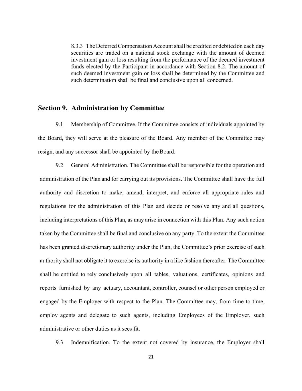 21 DD2326-10 8.3.3 The Deferred Compensation Account shall be credited or debited on each day securities are traded on a national stock exchange with the amount of deemed investment gain or loss resulting from the performance of the deemed investment funds elected by the Participant in accordance with Section 8.2. The amount of such deemed investment gain or loss shall be determined by the Committee and such determination shall be final and conclusive upon all concerned. Section 9. Administration by Committee 9.1 Membership of Committee. If the Committee consists of individuals appointed by the Board, they will serve at the pleasure of the Board. Any member of the Committee may resign, and any successor shall be appointed by the Board. 9.2 General Administration. The Committee shall be responsible for the operation and administration of the Plan and for carrying out its provisions. The Committee shall have the full authority and discretion to make, amend, interpret, and enforce all appropriate rules and regulations for the administration of this Plan and decide or resolve any and all questions, including interpretations of this Plan, as may arise in connection with this Plan. Any such action taken by the Committee shall be final and conclusive on any party. To the extent the Committee has been granted discretionary authority under the Plan, the Committee’s prior exercise of such authority shall not obligate it to exercise its authority in a like fashion thereafter. The Committee shall be entitled to rely conclusively upon all tables, valuations, certificates, opinions and reports furnished by any actuary, accountant, controller, counsel or other person employed or engaged by the Employer with respect to the Plan. The Committee may, from time to time, employ agents and delegate to such agents, including Employees of the Employer, such administrative or other duties as it sees fit. 9.3 Indemnification. To the extent not covered by insurance, the Employer shall