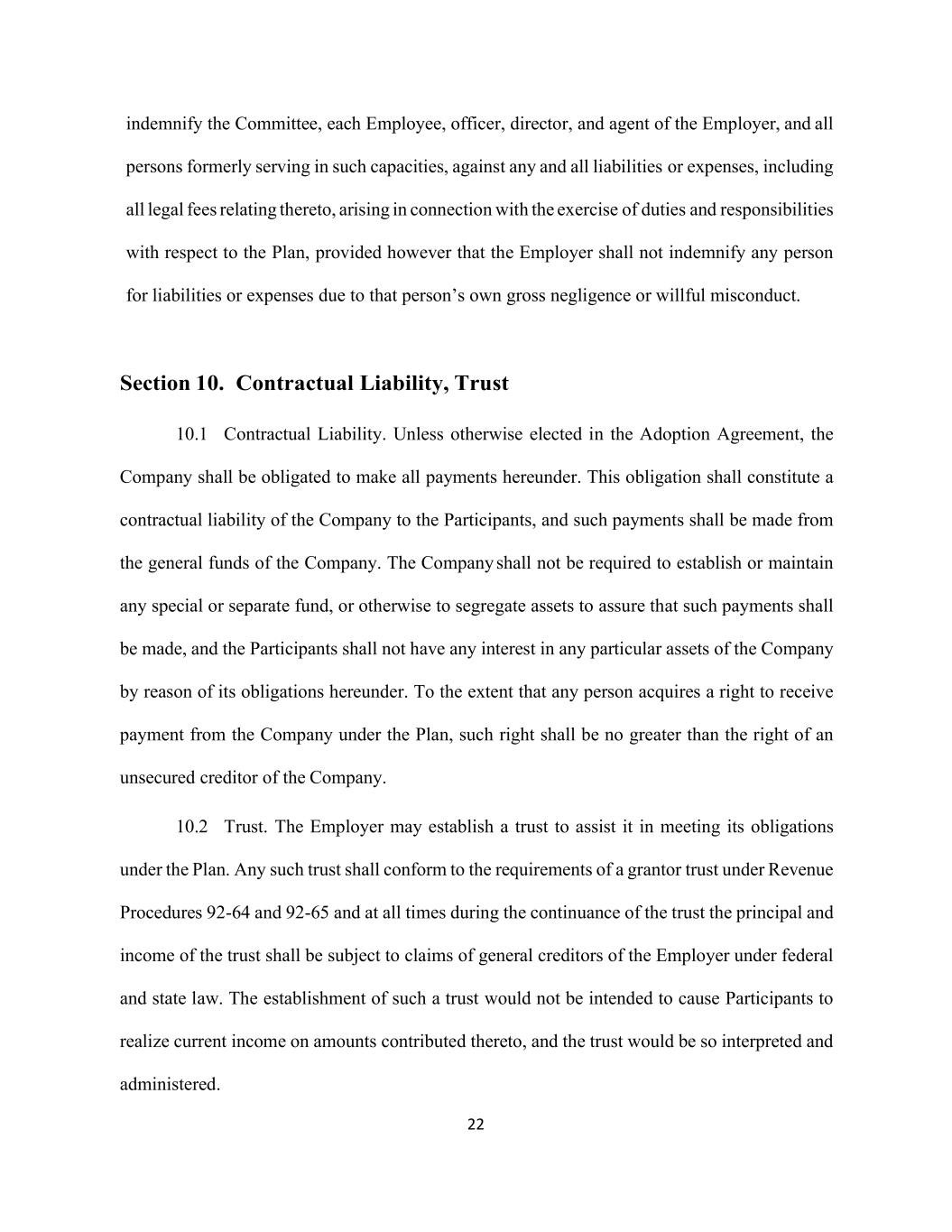 22 DD2326-10 indemnify the Committee, each Employee, officer, director, and agent of the Employer, and all persons formerly serving in such capacities, against any and all liabilities or expenses, including all legal fees relating thereto, arising in connection with the exercise of duties and responsibilities with respect to the Plan, provided however that the Employer shall not indemnify any person for liabilities or expenses due to that person’s own gross negligence or willful misconduct. Section 10. Contractual Liability, Trust 10.1 Contractual Liability. Unless otherwise elected in the Adoption Agreement, the Company shall be obligated to make all payments hereunder. This obligation shall constitute a contractual liability of the Company to the Participants, and such payments shall be made from the general funds of the Company. The Company shall not be required to establish or maintain any special or separate fund, or otherwise to segregate assets to assure that such payments shall be made, and the Participants shall not have any interest in any particular assets of the Company by reason of its obligations hereunder. To the extent that any person acquires a right to receive payment from the Company under the Plan, such right shall be no greater than the right of an unsecured creditor of the Company. 10.2 Trust. The Employer may establish a trust to assist it in meeting its obligations under the Plan. Any such trust shall conform to the requirements of a grantor trust under Revenue Procedures 92-64 and 92-65 and at all times during the continuance of the trust the principal and income of the trust shall be subject to claims of general creditors of the Employer under federal and state law. The establishment of such a trust would not be intended to cause Participants to realize current income on amounts contributed thereto, and the trust would be so interpreted and administered.