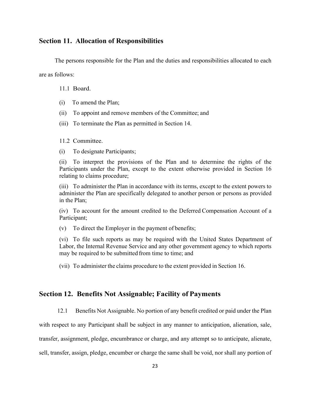 23 DD2326-10 Section 11. Allocation of Responsibilities The persons responsible for the Plan and the duties and responsibilities allocated to each are as follows: 11.1 Board. (i) To amend the Plan; (ii) To appoint and remove members of the Committee; and (iii) To terminate the Plan as permitted in Section 14. 11.2 Committee. (i) To designate Participants; (ii) To interpret the provisions of the Plan and to determine the rights of the Participants under the Plan, except to the extent otherwise provided in Section 16 relating to claims procedure; (iii) To administer the Plan in accordance with its terms, except to the extent powers to administer the Plan are specifically delegated to another person or persons as provided in the Plan; (iv) To account for the amount credited to the Deferred Compensation Account of a Participant; (v) To direct the Employer in the payment of benefits; (vi) To file such reports as may be required with the United States Department of Labor, the Internal Revenue Service and any other government agency to which reports may be required to be submitted from time to time; and (vii) To administer the claims procedure to the extent provided in Section 16. Section 12. Benefits Not Assignable; Facility of Payments 12.1 Benefits Not Assignable. No portion of any benefit credited or paid under the Plan with respect to any Participant shall be subject in any manner to anticipation, alienation, sale, transfer, assignment, pledge, encumbrance or charge, and any attempt so to anticipate, alienate, sell, transfer, assign, pledge, encumber or charge the same shall be void, nor shall any portion of