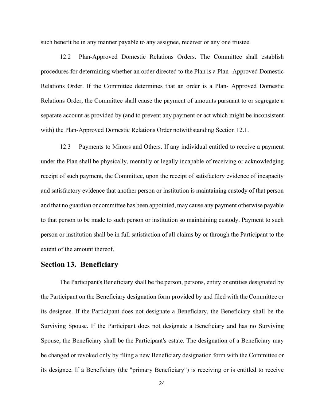 24 DD2326-10 such benefit be in any manner payable to any assignee, receiver or any one trustee. 12.2 Plan-Approved Domestic Relations Orders. The Committee shall establish procedures for determining whether an order directed to the Plan is a Plan- Approved Domestic Relations Order. If the Committee determines that an order is a Plan- Approved Domestic Relations Order, the Committee shall cause the payment of amounts pursuant to or segregate a separate account as provided by (and to prevent any payment or act which might be inconsistent with) the Plan-Approved Domestic Relations Order notwithstanding Section 12.1. 12.3 Payments to Minors and Others. If any individual entitled to receive a payment under the Plan shall be physically, mentally or legally incapable of receiving or acknowledging receipt of such payment, the Committee, upon the receipt of satisfactory evidence of incapacity and satisfactory evidence that another person or institution is maintaining custody of that person and that no guardian or committee has been appointed, may cause any payment otherwise payable to that person to be made to such person or institution so maintaining custody. Payment to such person or institution shall be in full satisfaction of all claims by or through the Participant to the extent of the amount thereof. Section 13. Beneficiary The Participant's Beneficiary shall be the person, persons, entity or entities designated by the Participant on the Beneficiary designation form provided by and filed with the Committee or its designee. If the Participant does not designate a Beneficiary, the Beneficiary shall be the Surviving Spouse. If the Participant does not designate a Beneficiary and has no Surviving Spouse, the Beneficiary shall be the Participant's estate. The designation of a Beneficiary may be changed or revoked only by filing a new Beneficiary designation form with the Committee or its designee. If a Beneficiary (the "primary Beneficiary") is receiving or is entitled to receive