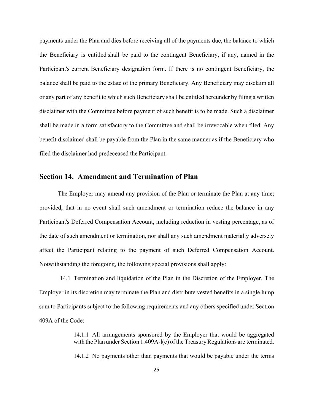 25 DD2326-10 payments under the Plan and dies before receiving all of the payments due, the balance to which the Beneficiary is entitled shall be paid to the contingent Beneficiary, if any, named in the Participant's current Beneficiary designation form. If there is no contingent Beneficiary, the balance shall be paid to the estate of the primary Beneficiary. Any Beneficiary may disclaim all or any part of any benefit to which such Beneficiary shall be entitled hereunder by filing a written disclaimer with the Committee before payment of such benefit is to be made. Such a disclaimer shall be made in a form satisfactory to the Committee and shall be irrevocable when filed. Any benefit disclaimed shall be payable from the Plan in the same manner as if the Beneficiary who filed the disclaimer had predeceased the Participant. Section 14. Amendment and Termination of Plan The Employer may amend any provision of the Plan or terminate the Plan at any time; provided, that in no event shall such amendment or termination reduce the balance in any Participant's Deferred Compensation Account, including reduction in vesting percentage, as of the date of such amendment or termination, nor shall any such amendment materially adversely affect the Participant relating to the payment of such Deferred Compensation Account. Notwithstanding the foregoing, the following special provisions shall apply: 14.1 Termination and liquidation of the Plan in the Discretion of the Employer. The Employer in its discretion may terminate the Plan and distribute vested benefits in a single lump sum to Participants subject to the following requirements and any others specified under Section 409A of the Code: 14.1.1 All arrangements sponsored by the Employer that would be aggregated with the Plan under Section 1.409A-l(c) of the Treasury Regulations are terminated. 14.1.2 No payments other than payments that would be payable under the terms