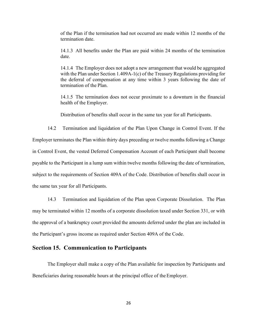 26 DD2326-10 of the Plan if the termination had not occurred are made within 12 months of the termination date. 14.1.3 All benefits under the Plan are paid within 24 months of the termination date. 14.1.4 The Employer does not adopt a new arrangement that would be aggregated with the Plan under Section 1.409A-1(c) of the Treasury Regulations providing for the deferral of compensation at any time within 3 years following the date of termination of the Plan. 14.1.5 The termination does not occur proximate to a downturn in the financial health of the Employer. Distribution of benefits shall occur in the same tax year for all Participants. 14.2 Termination and liquidation of the Plan Upon Change in Control Event. If the Employer terminates the Plan within thirty days preceding or twelve months following a Change in Control Event, the vested Deferred Compensation Account of each Participant shall become payable to the Participant in a lump sum within twelve months following the date of termination, subject to the requirements of Section 409A of the Code. Distribution of benefits shall occur in the same tax year for all Participants. 14.3 Termination and liquidation of the Plan upon Corporate Dissolution. The Plan may be terminated within 12 months of a corporate dissolution taxed under Section 331, or with the approval of a bankruptcy court provided the amounts deferred under the plan are included in the Participant’s gross income as required under Section 409A of the Code. Section 15. Communication to Participants The Employer shall make a copy of the Plan available for inspection by Participants and Beneficiaries during reasonable hours at the principal office of the Employer.