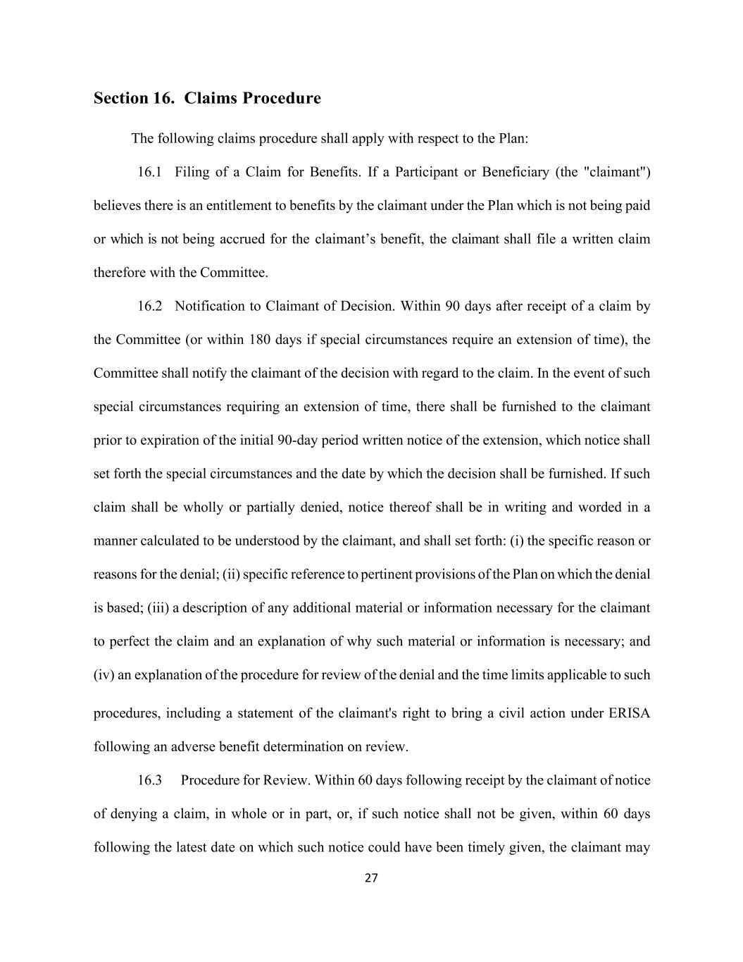 27 DD2326-10 Section 16. Claims Procedure The following claims procedure shall apply with respect to the Plan: 16.1 Filing of a Claim for Benefits. If a Participant or Beneficiary (the "claimant") believes there is an entitlement to benefits by the claimant under the Plan which is not being paid or which is not being accrued for the claimant’s benefit, the claimant shall file a written claim therefore with the Committee. 16.2 Notification to Claimant of Decision. Within 90 days after receipt of a claim by the Committee (or within 180 days if special circumstances require an extension of time), the Committee shall notify the claimant of the decision with regard to the claim. In the event of such special circumstances requiring an extension of time, there shall be furnished to the claimant prior to expiration of the initial 90-day period written notice of the extension, which notice shall set forth the special circumstances and the date by which the decision shall be furnished. If such claim shall be wholly or partially denied, notice thereof shall be in writing and worded in a manner calculated to be understood by the claimant, and shall set forth: (i) the specific reason or reasons for the denial; (ii) specific reference to pertinent provisions of the Plan on which the denial is based; (iii) a description of any additional material or information necessary for the claimant to perfect the claim and an explanation of why such material or information is necessary; and (iv) an explanation of the procedure for review of the denial and the time limits applicable to such procedures, including a statement of the claimant's right to bring a civil action under ERISA following an adverse benefit determination on review. 16.3 Procedure for Review. Within 60 days following receipt by the claimant of notice of denying a claim, in whole or in part, or, if such notice shall not be given, within 60 days following the latest date on which such notice could have been timely given, the claimant may