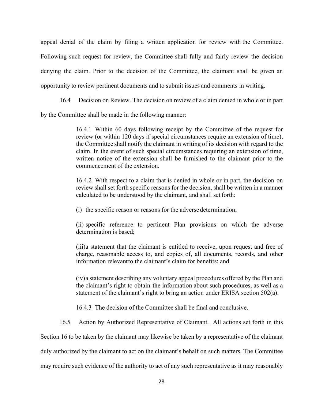 28 DD2326-10 appeal denial of the claim by filing a written application for review with the Committee. Following such request for review, the Committee shall fully and fairly review the decision denying the claim. Prior to the decision of the Committee, the claimant shall be given an opportunity to review pertinent documents and to submit issues and comments in writing. 16.4 Decision on Review. The decision on review of a claim denied in whole or in part by the Committee shall be made in the following manner: 16.4.1 Within 60 days following receipt by the Committee of the request for review (or within 120 days if special circumstances require an extension of time), the Committee shall notify the claimant in writing of its decision with regard to the claim. In the event of such special circumstances requiring an extension of time, written notice of the extension shall be furnished to the claimant prior to the commencement of the extension. 16.4.2 With respect to a claim that is denied in whole or in part, the decision on review shall set forth specific reasons for the decision, shall be written in a manner calculated to be understood by the claimant, and shall set forth: (i) the specific reason or reasons for the adverse determination; (ii) specific reference to pertinent Plan provisions on which the adverse determination is based; (iii) a statement that the claimant is entitled to receive, upon request and free of charge, reasonable access to, and copies of, all documents, records, and other information relevantto the claimant’s claim for benefits; and (iv)a statement describing any voluntary appeal procedures offered by the Plan and the claimant’s right to obtain the information about such procedures, as well as a statement of the claimant’s right to bring an action under ERISA section 502(a). 16.4.3 The decision of the Committee shall be final and conclusive. 16.5 Action by Authorized Representative of Claimant. All actions set forth in this Section 16 to be taken by the claimant may likewise be taken by a representative of the claimant duly authorized by the claimant to act on the claimant’s behalf on such matters. The Committee may require such evidence of the authority to act of any such representative as it may reasonably