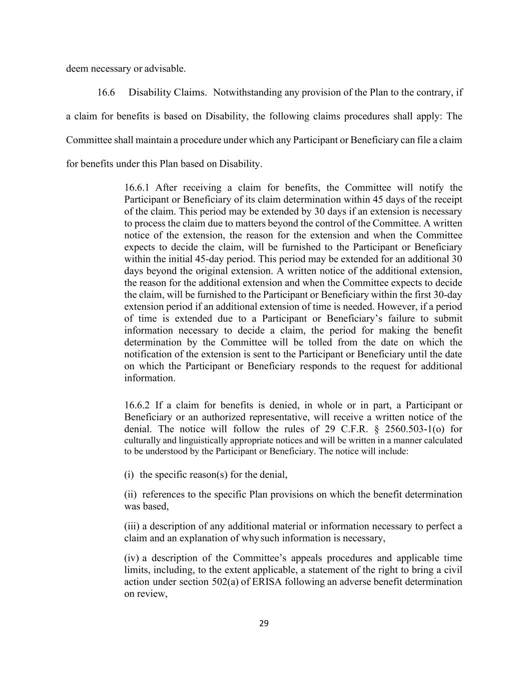 29 DD2326-10 deem necessary or advisable. 16.6 Disability Claims. Notwithstanding any provision of the Plan to the contrary, if a claim for benefits is based on Disability, the following claims procedures shall apply: The Committee shall maintain a procedure under which any Participant or Beneficiary can file a claim for benefits under this Plan based on Disability. 16.6.1 After receiving a claim for benefits, the Committee will notify the Participant or Beneficiary of its claim determination within 45 days of the receipt of the claim. This period may be extended by 30 days if an extension is necessary to process the claim due to matters beyond the control of the Committee. A written notice of the extension, the reason for the extension and when the Committee expects to decide the claim, will be furnished to the Participant or Beneficiary within the initial 45-day period. This period may be extended for an additional 30 days beyond the original extension. A written notice of the additional extension, the reason for the additional extension and when the Committee expects to decide the claim, will be furnished to the Participant or Beneficiary within the first 30-day extension period if an additional extension of time is needed. However, if a period of time is extended due to a Participant or Beneficiary’s failure to submit information necessary to decide a claim, the period for making the benefit determination by the Committee will be tolled from the date on which the notification of the extension is sent to the Participant or Beneficiary until the date on which the Participant or Beneficiary responds to the request for additional information. 16.6.2 If a claim for benefits is denied, in whole or in part, a Participant or Beneficiary or an authorized representative, will receive a written notice of the denial. The notice will follow the rules of 29 C.F.R. § 2560.503-1(o) for culturally and linguistically appropriate notices and will be written in a manner calculated to be understood by the Participant or Beneficiary. The notice will include: (i) the specific reason(s) for the denial, (ii) references to the specific Plan provisions on which the benefit determination was based, (iii) a description of any additional material or information necessary to perfect a claim and an explanation of why such information is necessary, (iv) a description of the Committee’s appeals procedures and applicable time limits, including, to the extent applicable, a statement of the right to bring a civil action under section 502(a) of ERISA following an adverse benefit determination on review,