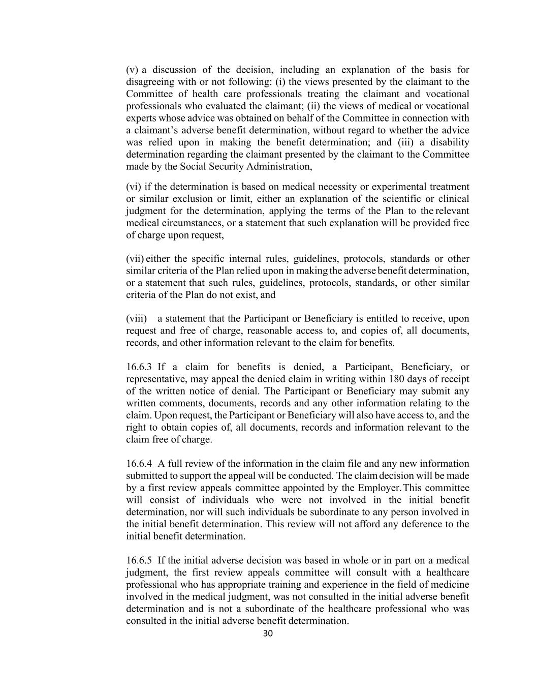 30 DD2326-10 (v) a discussion of the decision, including an explanation of the basis for disagreeing with or not following: (i) the views presented by the claimant to the Committee of health care professionals treating the claimant and vocational professionals who evaluated the claimant; (ii) the views of medical or vocational experts whose advice was obtained on behalf of the Committee in connection with a claimant’s adverse benefit determination, without regard to whether the advice was relied upon in making the benefit determination; and (iii) a disability determination regarding the claimant presented by the claimant to the Committee made by the Social Security Administration, (vi) if the determination is based on medical necessity or experimental treatment or similar exclusion or limit, either an explanation of the scientific or clinical judgment for the determination, applying the terms of the Plan to the relevant medical circumstances, or a statement that such explanation will be provided free of charge upon request, (vii) either the specific internal rules, guidelines, protocols, standards or other similar criteria of the Plan relied upon in making the adverse benefit determination, or a statement that such rules, guidelines, protocols, standards, or other similar criteria of the Plan do not exist, and (viii) a statement that the Participant or Beneficiary is entitled to receive, upon request and free of charge, reasonable access to, and copies of, all documents, records, and other information relevant to the claim for benefits. 16.6.3 If a claim for benefits is denied, a Participant, Beneficiary, or representative, may appeal the denied claim in writing within 180 days of receipt of the written notice of denial. The Participant or Beneficiary may submit any written comments, documents, records and any other information relating to the claim. Upon request, the Participant or Beneficiary will also have access to, and the right to obtain copies of, all documents, records and information relevant to the claim free of charge. 16.6.4 A full review of the information in the claim file and any new information submitted to support the appeal will be conducted. The claim decision will be made by a first review appeals committee appointed by the Employer. This committee will consist of individuals who were not involved in the initial benefit determination, nor will such individuals be subordinate to any person involved in the initial benefit determination. This review will not afford any deference to the initial benefit determination. 16.6.5 If the initial adverse decision was based in whole or in part on a medical judgment, the first review appeals committee will consult with a healthcare professional who has appropriate training and experience in the field of medicine involved in the medical judgment, was not consulted in the initial adverse benefit determination and is not a subordinate of the healthcare professional who was consulted in the initial adverse benefit determination.