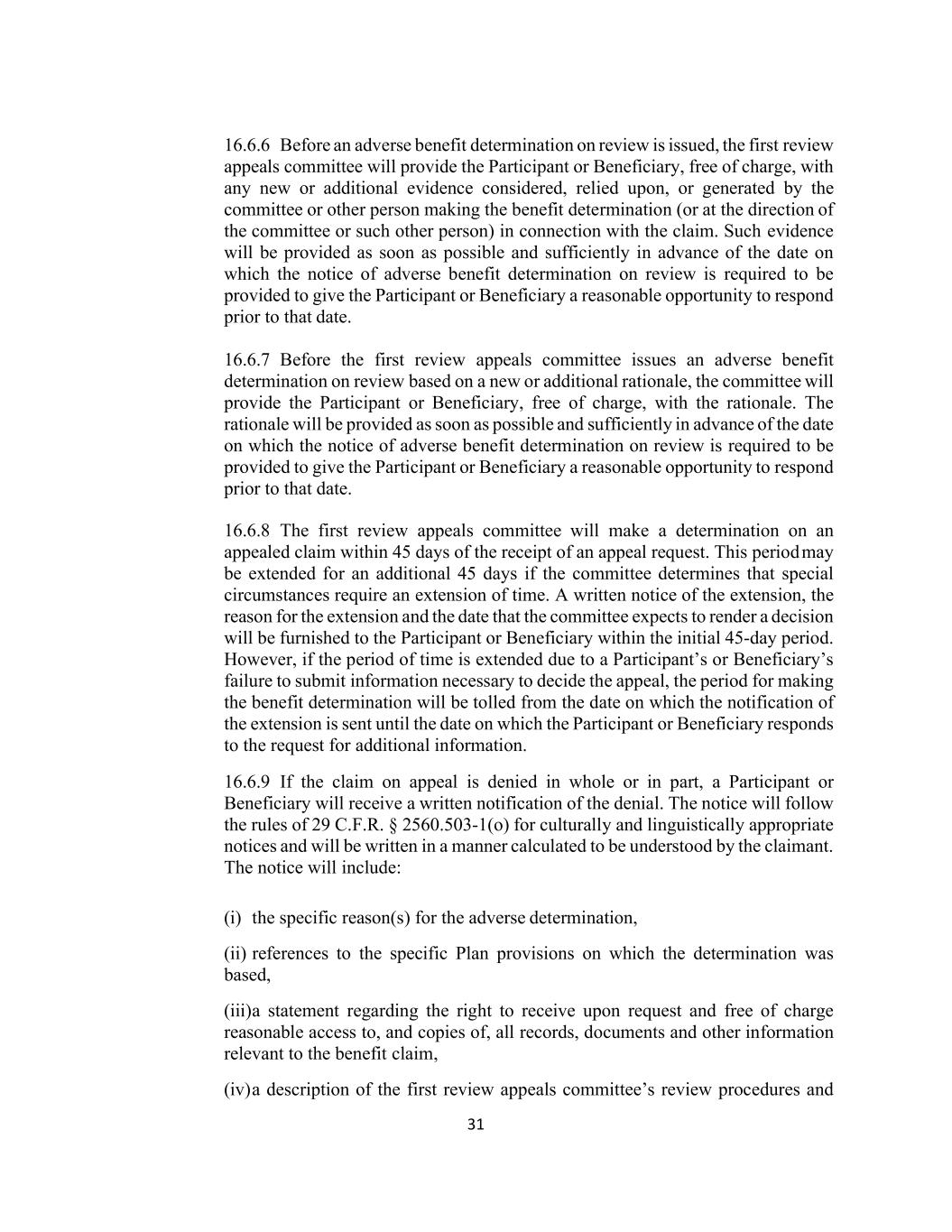31 DD2326-10 16.6.6 Before an adverse benefit determination on review is issued, the first review appeals committee will provide the Participant or Beneficiary, free of charge, with any new or additional evidence considered, relied upon, or generated by the committee or other person making the benefit determination (or at the direction of the committee or such other person) in connection with the claim. Such evidence will be provided as soon as possible and sufficiently in advance of the date on which the notice of adverse benefit determination on review is required to be provided to give the Participant or Beneficiary a reasonable opportunity to respond prior to that date. 16.6.7 Before the first review appeals committee issues an adverse benefit determination on review based on a new or additional rationale, the committee will provide the Participant or Beneficiary, free of charge, with the rationale. The rationale will be provided as soon as possible and sufficiently in advance of the date on which the notice of adverse benefit determination on review is required to be provided to give the Participant or Beneficiary a reasonable opportunity to respond prior to that date. 16.6.8 The first review appeals committee will make a determination on an appealed claim within 45 days of the receipt of an appeal request. This period may be extended for an additional 45 days if the committee determines that special circumstances require an extension of time. A written notice of the extension, the reason for the extension and the date that the committee expects to render a decision will be furnished to the Participant or Beneficiary within the initial 45-day period. However, if the period of time is extended due to a Participant’s or Beneficiary’s failure to submit information necessary to decide the appeal, the period for making the benefit determination will be tolled from the date on which the notification of the extension is sent until the date on which the Participant or Beneficiary responds to the request for additional information. 16.6.9 If the claim on appeal is denied in whole or in part, a Participant or Beneficiary will receive a written notification of the denial. The notice will follow the rules of 29 C.F.R. § 2560.503-1(o) for culturally and linguistically appropriate notices and will be written in a manner calculated to be understood by the claimant. The notice will include: (i) the specific reason(s) for the adverse determination, (ii) references to the specific Plan provisions on which the determination was based, (iii) a statement regarding the right to receive upon request and free of charge reasonable access to, and copies of, all records, documents and other information relevant to the benefit claim, (iv)a description of the first review appeals committee’s review procedures and