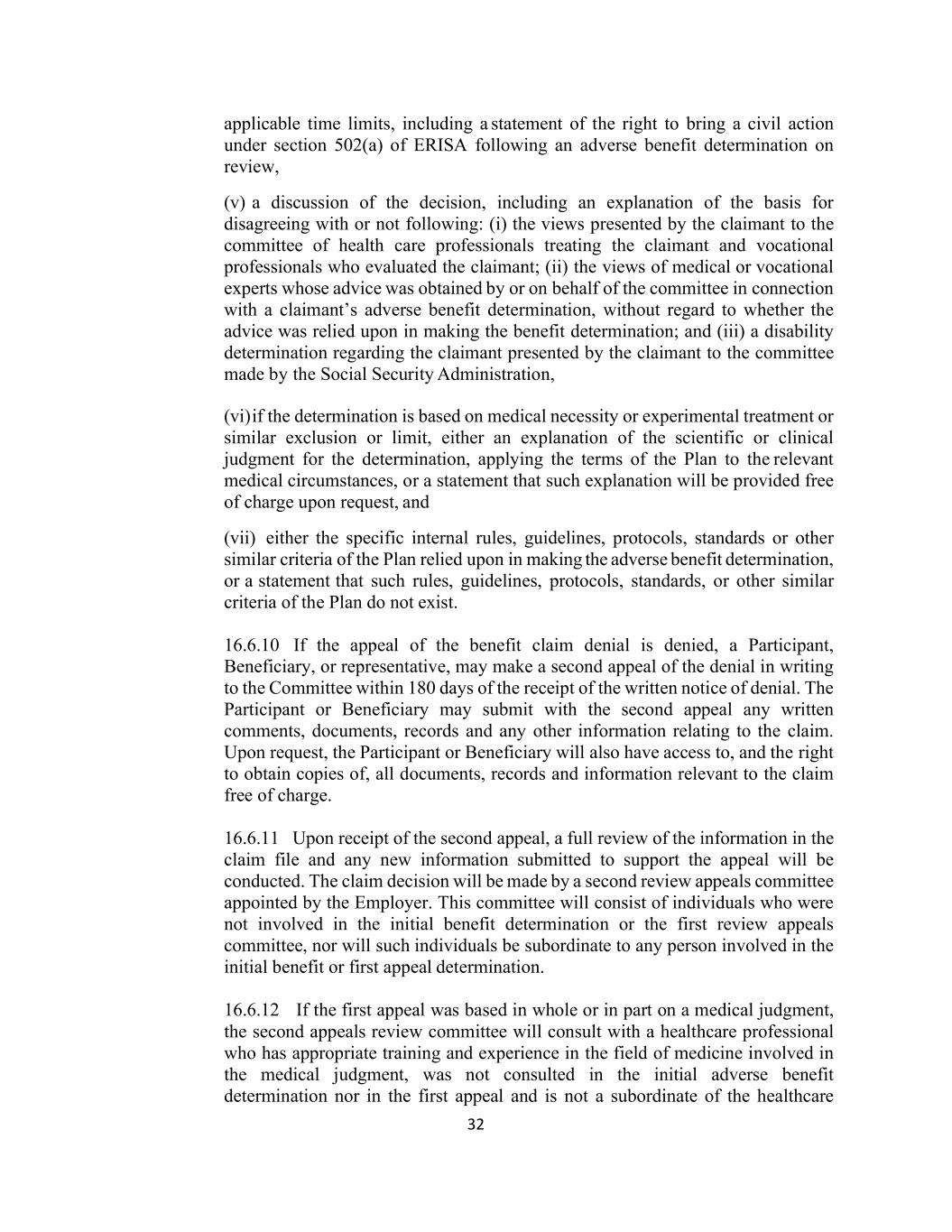 32 DD2326-10 applicable time limits, including a statement of the right to bring a civil action under section 502(a) of ERISA following an adverse benefit determination on review, (v) a discussion of the decision, including an explanation of the basis for disagreeing with or not following: (i) the views presented by the claimant to the committee of health care professionals treating the claimant and vocational professionals who evaluated the claimant; (ii) the views of medical or vocational experts whose advice was obtained by or on behalf of the committee in connection with a claimant’s adverse benefit determination, without regard to whether the advice was relied upon in making the benefit determination; and (iii) a disability determination regarding the claimant presented by the claimant to the committee made by the Social Security Administration, (vi)if the determination is based on medical necessity or experimental treatment or similar exclusion or limit, either an explanation of the scientific or clinical judgment for the determination, applying the terms of the Plan to the relevant medical circumstances, or a statement that such explanation will be provided free of charge upon request, and (vii) either the specific internal rules, guidelines, protocols, standards or other similar criteria of the Plan relied upon in making the adverse benefit determination, or a statement that such rules, guidelines, protocols, standards, or other similar criteria of the Plan do not exist. 16.6.10 If the appeal of the benefit claim denial is denied, a Participant, Beneficiary, or representative, may make a second appeal of the denial in writing to the Committee within 180 days of the receipt of the written notice of denial. The Participant or Beneficiary may submit with the second appeal any written comments, documents, records and any other information relating to the claim. Upon request, the Participant or Beneficiary will also have access to, and the right to obtain copies of, all documents, records and information relevant to the claim free of charge. 16.6.11 Upon receipt of the second appeal, a full review of the information in the claim file and any new information submitted to support the appeal will be conducted. The claim decision will be made by a second review appeals committee appointed by the Employer. This committee will consist of individuals who were not involved in the initial benefit determination or the first review appeals committee, nor will such individuals be subordinate to any person involved in the initial benefit or first appeal determination. 16.6.12 If the first appeal was based in whole or in part on a medical judgment, the second appeals review committee will consult with a healthcare professional who has appropriate training and experience in the field of medicine involved in the medical judgment, was not consulted in the initial adverse benefit determination nor in the first appeal and is not a subordinate of the healthcare