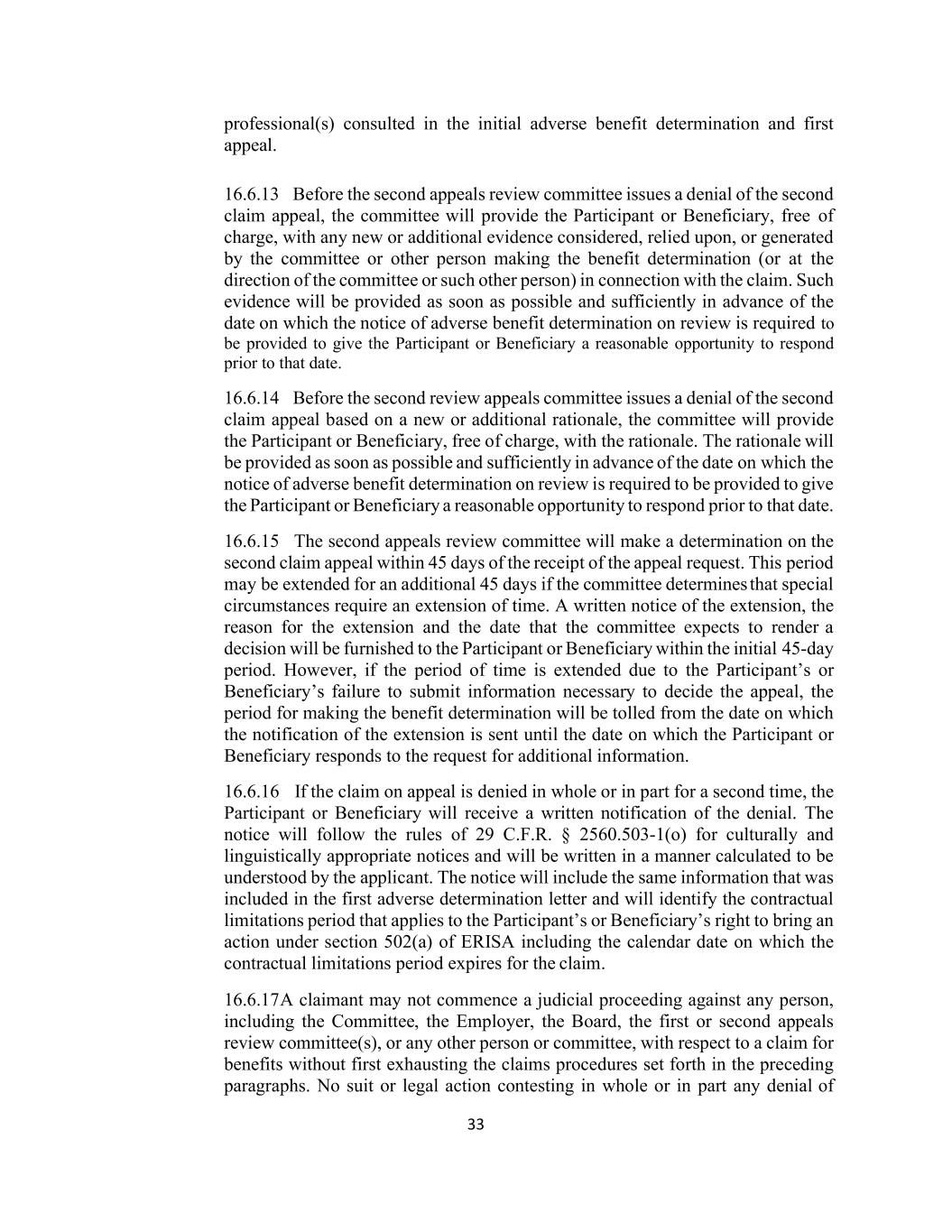 33 DD2326-10 professional(s) consulted in the initial adverse benefit determination and first appeal. 16.6.13 Before the second appeals review committee issues a denial of the second claim appeal, the committee will provide the Participant or Beneficiary, free of charge, with any new or additional evidence considered, relied upon, or generated by the committee or other person making the benefit determination (or at the direction of the committee or such other person) in connection with the claim. Such evidence will be provided as soon as possible and sufficiently in advance of the date on which the notice of adverse benefit determination on review is required to be provided to give the Participant or Beneficiary a reasonable opportunity to respond prior to that date. 16.6.14 Before the second review appeals committee issues a denial of the second claim appeal based on a new or additional rationale, the committee will provide the Participant or Beneficiary, free of charge, with the rationale. The rationale will be provided as soon as possible and sufficiently in advance of the date on which the notice of adverse benefit determination on review is required to be provided to give the Participant or Beneficiary a reasonable opportunity to respond prior to that date. 16.6.15 The second appeals review committee will make a determination on the second claim appeal within 45 days of the receipt of the appeal request. This period may be extended for an additional 45 days if the committee determines that special circumstances require an extension of time. A written notice of the extension, the reason for the extension and the date that the committee expects to render a decision will be furnished to the Participant or Beneficiary within the initial 45-day period. However, if the period of time is extended due to the Participant’s or Beneficiary’s failure to submit information necessary to decide the appeal, the period for making the benefit determination will be tolled from the date on which the notification of the extension is sent until the date on which the Participant or Beneficiary responds to the request for additional information. 16.6.16 If the claim on appeal is denied in whole or in part for a second time, the Participant or Beneficiary will receive a written notification of the denial. The notice will follow the rules of 29 C.F.R. § 2560.503-1(o) for culturally and linguistically appropriate notices and will be written in a manner calculated to be understood by the applicant. The notice will include the same information that was included in the first adverse determination letter and will identify the contractual limitations period that applies to the Participant’s or Beneficiary’s right to bring an action under section 502(a) of ERISA including the calendar date on which the contractual limitations period expires for the claim. 16.6.17 A claimant may not commence a judicial proceeding against any person, including the Committee, the Employer, the Board, the first or second appeals review committee(s), or any other person or committee, with respect to a claim for benefits without first exhausting the claims procedures set forth in the preceding paragraphs. No suit or legal action contesting in whole or in part any denial of