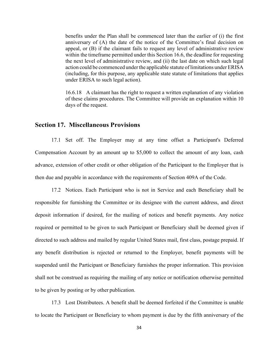 34 DD2326-10 benefits under the Plan shall be commenced later than the earlier of (i) the first anniversary of (A) the date of the notice of the Committee’s final decision on appeal, or (B) if the claimant fails to request any level of administrative review within the timeframe permitted under this Section 16.6, the deadline for requesting the next level of administrative review, and (ii) the last date on which such legal action could be commenced under the applicable statute of limitations under ERISA (including, for this purpose, any applicable state statute of limitations that applies under ERISA to such legal action). 16.6.18 A claimant has the right to request a written explanation of any violation of these claims procedures. The Committee will provide an explanation within 10 days of the request. Section 17. Miscellaneous Provisions 17.1 Set off. The Employer may at any time offset a Participant's Deferred Compensation Account by an amount up to $5,000 to collect the amount of any loan, cash advance, extension of other credit or other obligation of the Participant to the Employer that is then due and payable in accordance with the requirements of Section 409A of the Code. 17.2 Notices. Each Participant who is not in Service and each Beneficiary shall be responsible for furnishing the Committee or its designee with the current address, and direct deposit information if desired, for the mailing of notices and benefit payments. Any notice required or permitted to be given to such Participant or Beneficiary shall be deemed given if directed to such address and mailed by regular United States mail, first class, postage prepaid. If any benefit distribution is rejected or returned to the Employer, benefit payments will be suspended until the Participant or Beneficiary furnishes the proper information. This provision shall not be construed as requiring the mailing of any notice or notification otherwise permitted to be given by posting or by other publication. 17.3 Lost Distributees. A benefit shall be deemed forfeited if the Committee is unable to locate the Participant or Beneficiary to whom payment is due by the fifth anniversary of the