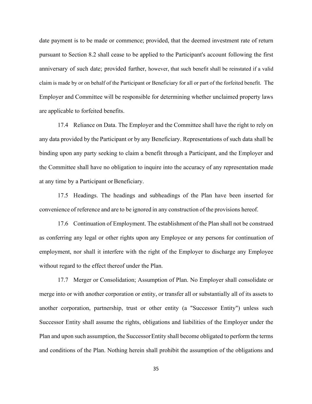 35 DD2326-10 date payment is to be made or commence; provided, that the deemed investment rate of return pursuant to Section 8.2 shall cease to be applied to the Participant's account following the first anniversary of such date; provided further, however, that such benefit shall be reinstated if a valid claim is made by or on behalf of the Participant or Beneficiary for all or part of the forfeited benefit. The Employer and Committee will be responsible for determining whether unclaimed property laws are applicable to forfeited benefits. 17.4 Reliance on Data. The Employer and the Committee shall have the right to rely on any data provided by the Participant or by any Beneficiary. Representations of such data shall be binding upon any party seeking to claim a benefit through a Participant, and the Employer and the Committee shall have no obligation to inquire into the accuracy of any representation made at any time by a Participant or Beneficiary. 17.5 Headings. The headings and subheadings of the Plan have been inserted for convenience of reference and are to be ignored in any construction of the provisions hereof. 17.6 Continuation of Employment. The establishment of the Plan shall not be construed as conferring any legal or other rights upon any Employee or any persons for continuation of employment, nor shall it interfere with the right of the Employer to discharge any Employee without regard to the effect thereof under the Plan. 17.7 Merger or Consolidation; Assumption of Plan. No Employer shall consolidate or merge into or with another corporation or entity, or transfer all or substantially all of its assets to another corporation, partnership, trust or other entity (a "Successor Entity") unless such Successor Entity shall assume the rights, obligations and liabilities of the Employer under the Plan and upon such assumption, the SuccessorEntity shall become obligated to perform the terms and conditions of the Plan. Nothing herein shall prohibit the assumption of the obligations and