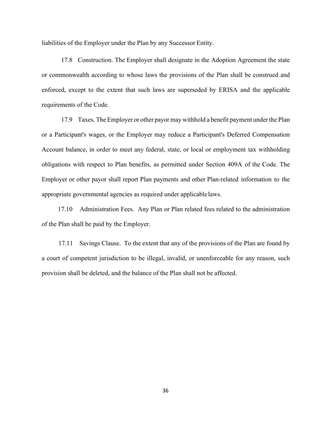 36 DD2326-10 liabilities of the Employer under the Plan by any Successor Entity. 17.8 Construction. The Employer shall designate in the Adoption Agreement the state or commonwealth according to whose laws the provisions of the Plan shall be construed and enforced, except to the extent that such laws are superseded by ERISA and the applicable requirements of the Code. 17.9 Taxes. The Employer or other payor may withhold a benefit payment under the Plan or a Participant's wages, or the Employer may reduce a Participant's Deferred Compensation Account balance, in order to meet any federal, state, or local or employment tax withholding obligations with respect to Plan benefits, as permitted under Section 409A of the Code. The Employer or other payor shall report Plan payments and other Plan-related information to the appropriate governmental agencies as required under applicable laws. 17.10 Administration Fees. Any Plan or Plan related fees related to the administration of the Plan shall be paid by the Employer. 17.11 Savings Clause. To the extent that any of the provisions of the Plan are found by a court of competent jurisdiction to be illegal, invalid, or unenforceable for any reason, such provision shall be deleted, and the balance of the Plan shall not be affected.