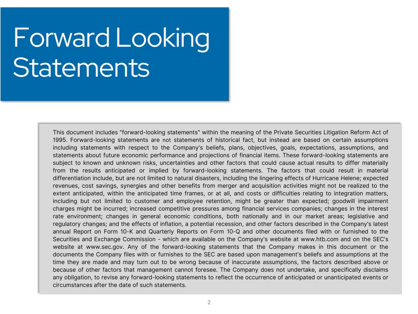 This document includes "forward-looking statements" within the meaning of the Private Securities Litigation Reform Act of 1995. Forward-looking statements are not statements of historical fact, but instead are based on certain assumptions including statements with respect to the Company's beliefs, plans, objectives, goals, expectations, assumptions, and statements about future economic performance and projections of financial items. These forward-looking statements are subject to known and unknown risks, uncertainties and other factors that could cause actual results to differ materially from the results anticipated or implied by forward-looking statements. The factors that could result in material differentiation include, but are not limited to natural disasters, including the lingering effects of Hurricane Helene; expected revenues, cost savings, synergies and other benefits from merger and acquisition activities might not be realized to the extent anticipated, within the anticipated time frames, or at all, and costs or difficulties relating to integration matters, including but not limited to customer and employee retention, might be greater than expected; goodwill impairment charges might be incurred; increased competitive pressures among financial services companies; changes in the interest rate environment; changes in general economic conditions, both nationally and in our market areas; legislative and regulatory changes; and the effects of inflation, a potential recession, and other factors described in the Company's latest annual Report on Form 10-K and Quarterly Reports on Form 10-Q and other documents filed with or furnished to the Securities and Exchange Commission - which are available on the Company's website at www.htb.com and on the SEC's website at www.sec.gov. Any of the forward-looking statements that the Company makes in this document or the documents the Company files with or furnishes to the SEC are based upon management's beliefs and assumptions at the time they are made and may turn out to be wrong because of inaccurate assumptions, the factors described above or because of other factors that management cannot foresee. The Company does not undertake, and specifically disclaims any obligation, to revise any forward-looking statements to reflect the occurrence of anticipated or unanticipated events or circumstances after the date of such statements. Forward Looking Statements 2