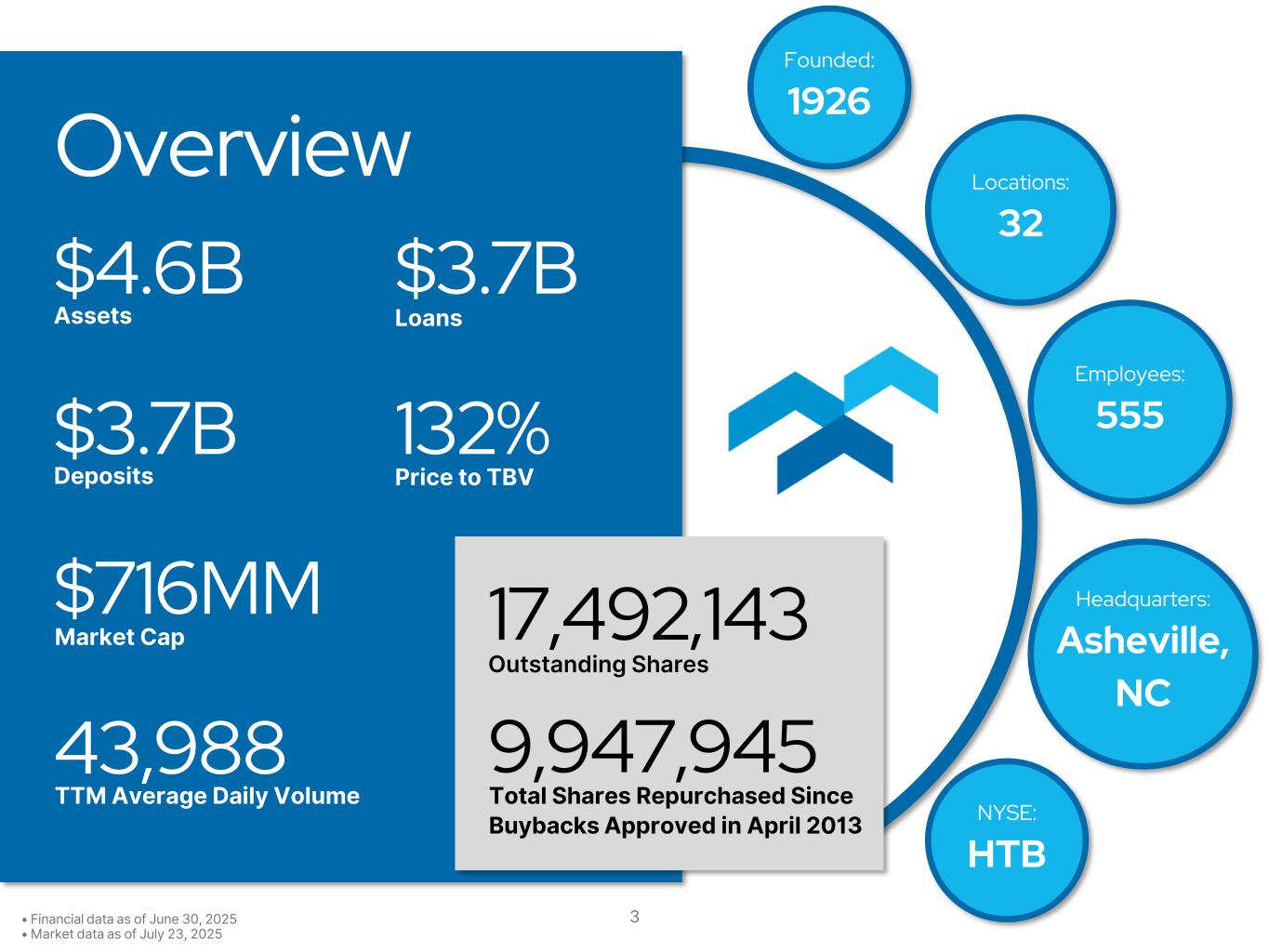 Founded: 1926 Locations: 32 Employees: 555 Headquarters: Asheville, NC NYSE: HTB Overview $4.6B Assets $3.7B Loans $3.7B Deposits 132% Price to TBV 9,947,945 Total Shares Repurchased Since Buybacks Approved in April 2013 $716MM Market Cap 43,988 TTM Average Daily Volume 17,492,143 Outstanding Shares • Financial data as of June 30, 2025 • Market data as of July 23, 2025 3